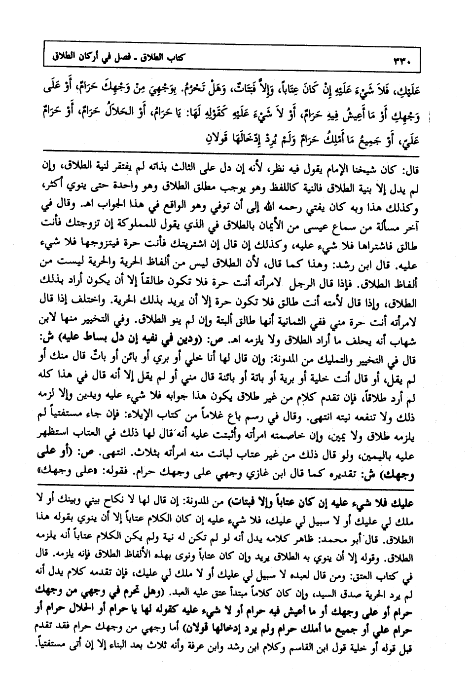 عليك، فلا شيء عليه إن كان عتابا، وإلا فبتات، وهل تحرم. بوجهي من وجهك حرام أو على وجهك أو ما أعيش فيه حرام، أو لا شيء عليه كقوله لها: يا حرام، أو الحلال حرام، أو حرام علي، أو جميع ما أملك حرام ولم يرد إدخالها قولان.