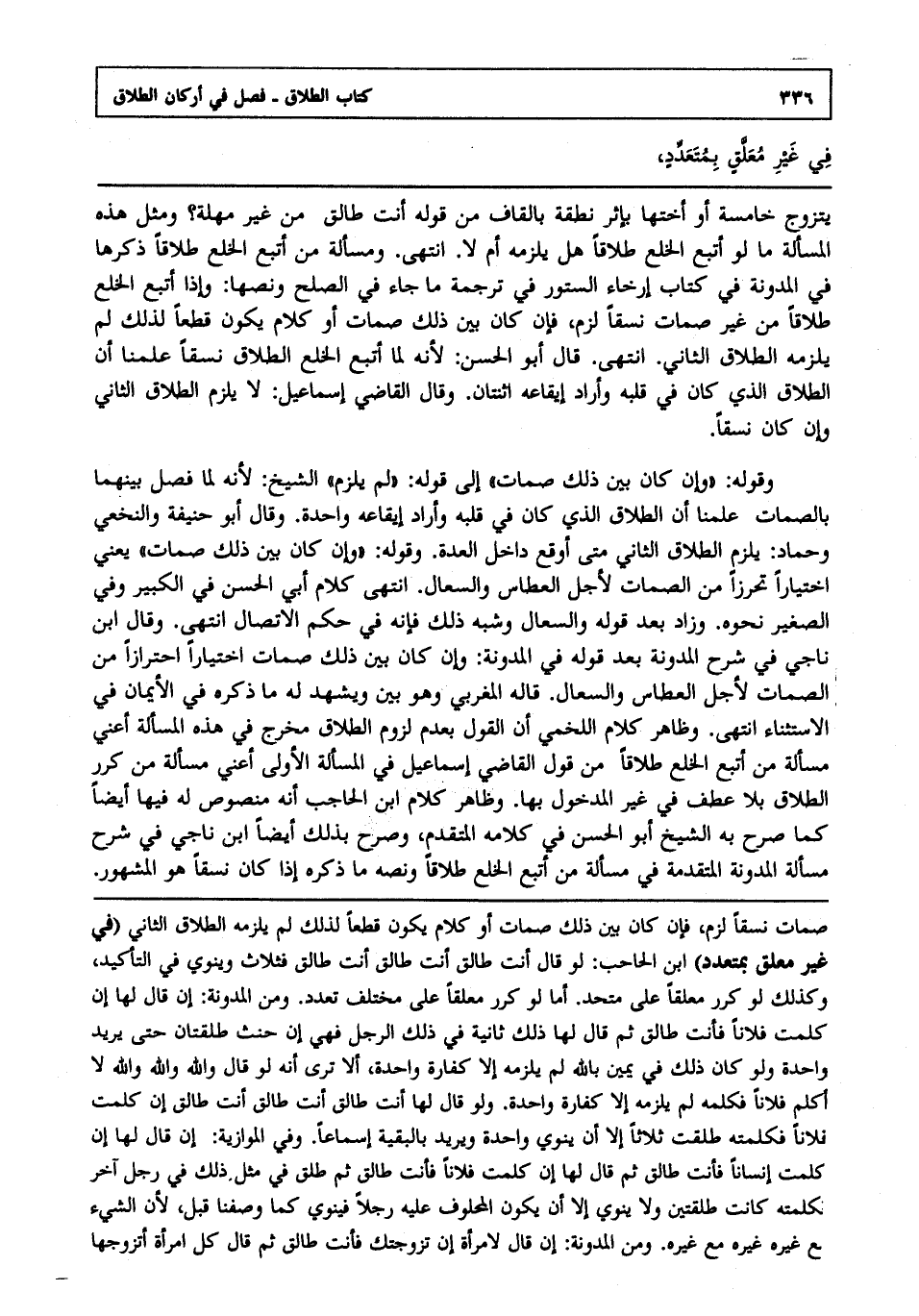 وقوله: "وإن كان بين ذلك صمات" إلى قوله: "لم يلزم" الشيخ: لأنه لما فصل بينهما بالصمات علمنا أن الطلاق الذي كان في قلبه وأراد إيقاعه واحدة وقال أبو حنيفة والنخعي وحماد يلزم الطلاق الثاني متى أوقع داخل العدة وقوله: "وإن كان بين ذلك صمات" يعني اختيارا تحرزا من الصمات لأجل العطاس والسعال انتهى. كلام أبي الحسن في الكبير وفي الصغير نحوه وزاد بعد قوله والسعال وشبه ذلك فإنه في حكم الاتصال انتهى. وقال ابن ناجي في شرح المدونة بعد قوله في المدونة وإن كان بين ذلك صمات اختيارا احترازا من الصمات لأجل العطاس والسعال قاله المغربي وهو بين ويشهد له ما ذكره في الأيمان في الاستثناء انتهى. وظاهر كلام اللخمي أن القول بعدم لزوم الطلاق مخرج في هذه المسألة أعني مسألة من أتبع الخلع طلاقا من قول القاضي إسماعيل في المسألة الأولى أعني مسألة من كرر الطلاق بلا عطف في غير المدخول بها وظاهر كلام ابن الحاجب أنه منصوص له فيها أيضا كما صرح به الشيخ أبو الحسن في كلامه المتقدم وصرح بذلك أيضا ابن ناجي في شرح مسألة المدونة المتقدمة في مسألة من أتبع الخلع طلاقا ونصه ما ذكره إذا كان نسقا هو المشهور.