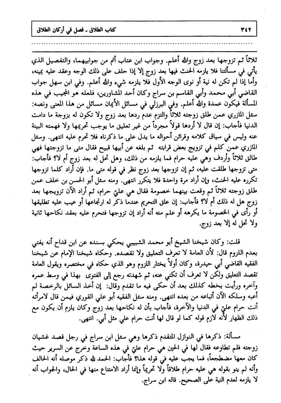 ثلاثا ثم تزوجها بعد زوج والله أعلم. وجواب ابن عتاب أتم من جوابيهما والتفصيل الذي يأتي في مسألتنا فلا يلزمه الحنث فيها بعد زوج إلا إذا حلف على ذلك الوجه وعقد عليه يمينه وأما إذا لم تكن له نية أو نوى الوجه الأول فلا يلزمه شيء والله أعلم. وفي ابن سهل جواب القاضي أبي محمد وأبي القاسم بن سراج وكان أحد المشاورين فلعله هو المجيب في هذه المسألة فيكون عمدة والله أعلم. وفي البرزلي في مسائل الأيمان مسائل من هذا المعنى ونصه سئل المازري عمن طلق زوجته ثلاثا والتزم عدم ردها بعد زوج ولا تكون له بزوجة ما دامت الدنيا فأجاب إن قال لا أردها قولا مجردا من غير تعليق ما يوجب تحريمها ولا فهمته البينة عنه وليس في سياق كلامه وقرائن أحواله ما يدل على ما ذكرناه فلا تحرم عليه انتهى. وسئل المازري عمن كلم في تزويج بعض قرابته ثم بلغه عن أبيها قبيح فقال متى ما تزوجتها فهي طالق ثلاثا وأردف وهي عليه حرام فما يلزمه من ذلك وهل تحل له بعد زوج أم لا فأجاب متى تزوجها طلقت عليه ثم إن تزوجها بعد زوج نظر في قوله متى ما فإن أراد كلما تزوجها تكرره عليه الحنث وإن أراد مرة واحدة فلا يتكرر انتهى. ومنه سئل أبو الحسن بن خلف عمن طلق زوجته ثلاثا ثم وقعت بينهما خصومة فقال هي علي حرام ثم أراد الآن تزويجها بعد زوج هل له ذلك أم لا فأجاب إن علق التحريم عندما ذكر له ارتجاعها أو عيب عليه تطليقها أو رأى في الخصومة ما يكرهه أو علم منه أنه أراد إن تزوجها فتحرم عليه بعقد نكاحها ثانية ولا تحل له إلا بعد زوج.