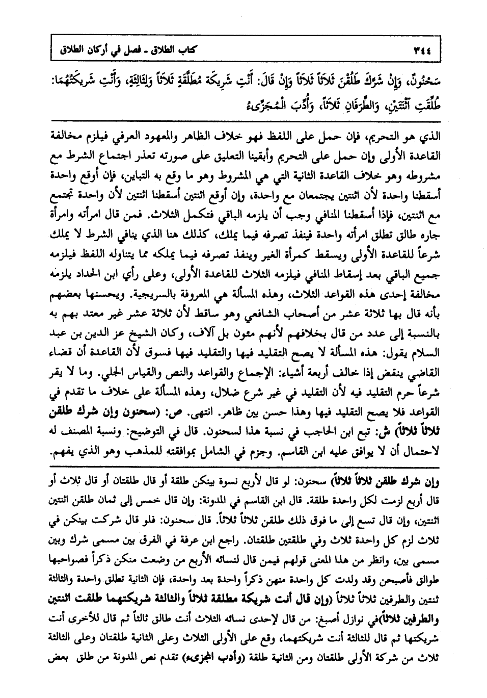 سحنون، وإن شرك طلقن ثلاثا ثلاثا وإن قال أنت شريكة مطلقة ثلاثا ولثالثة، وأنت شريكتهما طلقت اثنتين، والطرفان ثلاثا، وأدب المجزئ