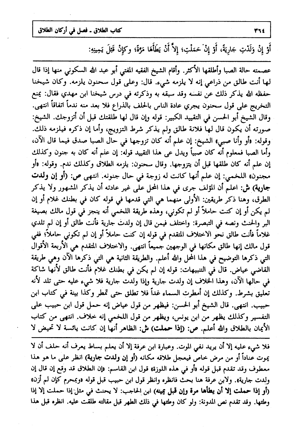 عصمته حالة الصبا وأطلقها الأكثر وأقام الشيخ الفقيه المفتي أبو عبد الله السكوني منها إذا قال لها أنت طالق من ذراعي إنه لا يلزمه شيء قال: وعلى قول سحنون يلزمه وكان شيخنا حفظه الله يذكر ذلك عن نفسه وقد سبقه به وذكرته في درس شيخنا ابن مهدي فقال يمنع التخريج على قول سحنون يجري عادة الناس بالحلف بالذراع فلا بعد منه ندما اتفاقا انتهى. وقال الشيخ أبو الحسن في التقييد الكبير: قوله وإن قال لها طلقتك قبل أن أتزوجك الشيخ صورته أن يكون قال: لها فلانة طالق ولم يذكر شرط التزويج وأما إن ذكره فيلزمه ذلك وقوله: "أو وأنا صبي" الشيخ إن علم أنه كان تزوجها في حال الصبا صدق فيما قال: الآن وأما الصبا فمعلوم أنه كان صبيا ويدل على هذا التقييد قوله إن علم أنه كان به جنون وكذلك إن علم أنه كان طلقها قبل أن يتزوجها وقال سحنون يلزمه الطلاق وكذلك ندم وقوله: "أو مجنون" اللخمي إن علم أنها كانت له زوجة في حال جنونه انتهى. ص: "أو إن ولدت جارية" ش: أعلم أن المؤلف جرى في هذا المحل على غير عادته أن يذكر المشهور ولا يذكر الطرق وهنا ذكر طريقين الأولى منهما هي التي قدمها في قوله كان في بطنك غلام أو إن لم يكن أو إن كنت حاملا أو لم تكوني وهذه الطريقة اللخمي أنه ينجز في قول مالك بصيغة البر والحنث ونصه في التبصرة واختلف فيمن قال: إن ولدت جارية فأنت طالق أو إن لم تلدي غلاما فأنت طالق نحو الاختلاف المتقدم في قوله إن كنت حاملا أو إن لم تكوني حاملا ففي قول مالك إنها طالق مكانها في الوجهين جميعا انتهى. والاختلاف المتقدم هي الأربعة الأقوال التي ذكرها التوضيح في هذا المحل والله أعلم. والطريقة الثانية هي التي ذكرها الآن وهي طريقة القاضي عياض قال في التنبيهات: قوله إن لم يكن في بطنك غلام فأنت طالق لأنها شاكة في حالها الآن وهذا الخلاف إن ولدت جارية وإذا ولدت جارية فلا شيء عليه حتى تلد لأنه تعليق بسرعة وكذلك إن أمطرت السماء غدا بينة في كتاب ابن حبيب انتهى. قال الشيخ أبو الحسن: فيظهر من قول عياض إنه حمل قول ابن حبيب على التفسير وكذلك يظهر من ابن يونس ويظهر من قول اللخمي إنه خلاف انتهى. من كتاب الأيمان بالطلاق والله أعلم. ص: "إذا حملت" ش: الظاهر أنها إن كانت يائسة لا تحيض لا
