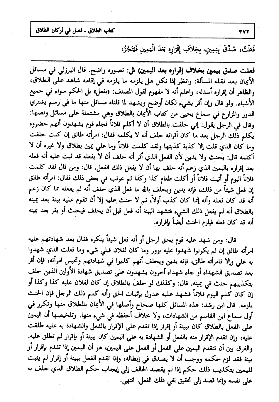 قال: ومن شهد عليه قوم بحق لرجل أو أنه فعل شيئا ينكره فقال بعد شهادتهم عليه امرأته طالق إن لم يكونوا شهدوا عليه بزور وما كان لفلان قبلي شيء وما فعلت الذي شهدوا به علي وإلا فامرأته طالق فإنه يدين ويحلف أنهم كذبوا في شهادتهم وتحبس امرأته فإن أقر بعد تصديق الشهداء أو جاء شهداء آخرون يشهدون على تصديق شهادة الأولين الذين حلف بتكذيبهم حنث في يمينه قال: وكذلك لو حلف بالطلاق إن كان لفلان عليه كذا وكذا أو إن كان كلم اليوم فلانا فشهد عليه عدول بإثبات الحق وأنه كلم ذلك الرجل فإن الحنث يلزمه قال ابن رشد: هذه المسائل كلها صحاح وأصلها في الأيمان بالطلاق منها وتكرر في أول سماع ابن القاسم من الشهادات ولا خلاف أحفظه في شيء منها وتلخيصها أن اليمين على الفعل بالطلاق كان ببينة أو إقرار إذا تقدم على الإقرار بالفعل والشهادة به عليه طلقت عليه وإن تقدم الإقرار منه بالفعل أو الشهادة به على اليمين كان ببينة أو بإقرار لم تطلق عليه والفرق بين أن تتقدم اليمين على الفعل أو الفعل على اليمين هو أن اليمين إذا تقدم بإقرار أو بينة فقد لزم حكمه ووجب أن لا يصدق في إبطاله وإذا تقدم الفعل ببينة أو إقرار لم يثبت لليمين بتكذيب ذلك حكم إذا لم يقصد الحالف إلى إيجاب حكم الطلاق الذي حلف به على نفسه وإنما قصد إلى تحقيق نفي ذلك الفعل انتهى.