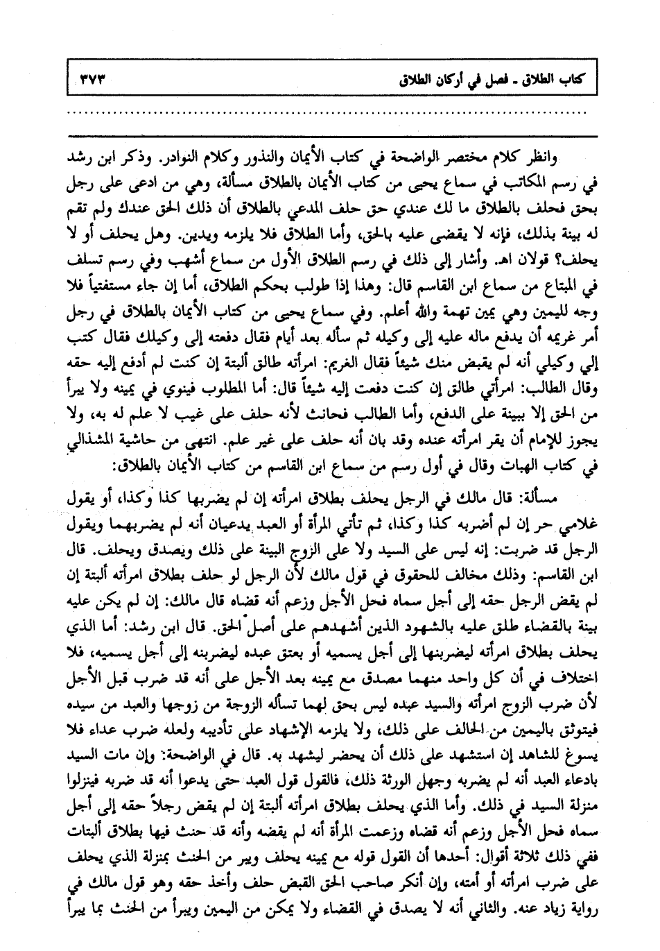 وانظر كلام مختصر الواضحة في كتاب الأيمان والنذور وكلام النوادر وذكر ابن رشد في رسم المكاتب في سماع يحيى من كتاب الأيمان بالطلاق مسألة وهي من ادعى على رجل بحق فحلف بالطلاق ما لك عندي حق حلف المدعي بالطلاق أن ذلك الحق عندك ولم تقم له بينة بذلك فإنه لا يقضى عليه بالحق وأما الطلاق فلا يلزمه ويدين وهل يحلف أو لا يحلف؟ قولان انتهى. وأشار إلى ذلك في رسم الطلاق الأول من سماع أشهب وفي رسم تسلف في المبتاع من سماع ابن القاسم قال: وهذا إذا طولب بحكم الطلاق أما إن جاء مستفتيا فلا وجه لليمين وهي يمين تهمة والله أعلم. وفي سماع يحيى من كتاب الأيمان بالطلاق في رجل أمر غريمه أن يدفع ماله عليه إلى وكيله ثم سأله بعد أيام فقال دفعته إلى وكيلك فقال كتب إلي وكيلي أنه لم يقبض منك شيئا فقال الغريم امرأته طالق ألبتة إن كنت لم أدفع إليه حقه وقال الطالب امرأتي طالق إن كنت دفعت إليه شيئا قال أما المطلوب فينوي في يمينه ولا يبرأ من الحق إلا ببينة على الدفع وأما الطالب فحانث لأنه حلف على غيب لا علم له به ولا يجوز للإمام أن يقر امرأته عنده وقد بان أنه حلف على غير علم انتهى. من حاشية المشذالي في كتاب الهبات وقال في أول رسم من سماع ابن القاسم من كتاب الأيمان بالطلاق. مسألة: قال مالك في الرجل يحلف بطلاق امرأته إن لم يضربها كذا وكذا أو يقول غلامي حر إن لم أضربه كذا وكذا ثم تأتي المرأة أو العبد يدعيان أنه لم يضربهما ويقول الرجل قد ضربت إنه ليس على السيد ولا على الزوج البينة على ذلك ويصدق ويحلف قال ابن القاسم وذلك مخالف للحقوق في قول مالك لأن الرجل لو حلف بطلاق امرأته ألبتة إن لم يقض الرجل حقه إلى أجل سماه فحل الأجل وزعم أنه قضاه قال مالك: إن لم يكن عليه بينة بالقضاء طلق عليه بالشهود الذين أشهدهم على أصل الحق قال ابن رشد: أما الذي يحلف بطلاق امرأته ليضربنها إلى أجل يسميه أو بعتق عبده ليضربنه إلى أجل يسميه فلا اختلاف في أن كل واحد منهما مصدق مع يمينه بعد الأجل على أنه قد ضرب قبل الأجل لأن ضرب الزوج امرأته والسيد عبده ليس بحق لهما تسأله الزوجة من زوجها والعبد من سيده فيتوثق باليمين من الحالف على ذلك ولا يلزمه الإشهاد على تأديبه ولعله ضرب عداء فلا يسوغ للشاهد إن استشهد على ذلك أن يحضر ليشهد به قال: في الواضحة وإن مات السيد بادعاء العبد أنه لم يضربه وجهل الورثة ذلك فالقول قول العبد حتى يدعوا أنه قد ضربه فينزلوا منزلة السيد في ذلك وأما الذي يحلف بطلاق امرأته ألبتة إن لم يقض رجلا حقه إلى أجل سماه فحل الأجل وزعم أنه قضاه وزعمت المرأة أنه لم يقضه وأنه قد حنث فيها بطلاق ألبتات ففي ذلك ثلاثة أقوال أحدها أن القول قوله مع يمينه يحلف ويبر من الحنث بمنزلة الذي يحلف على ضرب امرأته أو أمته وإن أنكر صاحب الحق القبض حلف وأخذ حقه وهو قول مالك في رواية زياد عنه والثاني: أنه لا يصدق في القضاء ولا يمكن من اليمين ويبرأ من الحنث بما يبرأ