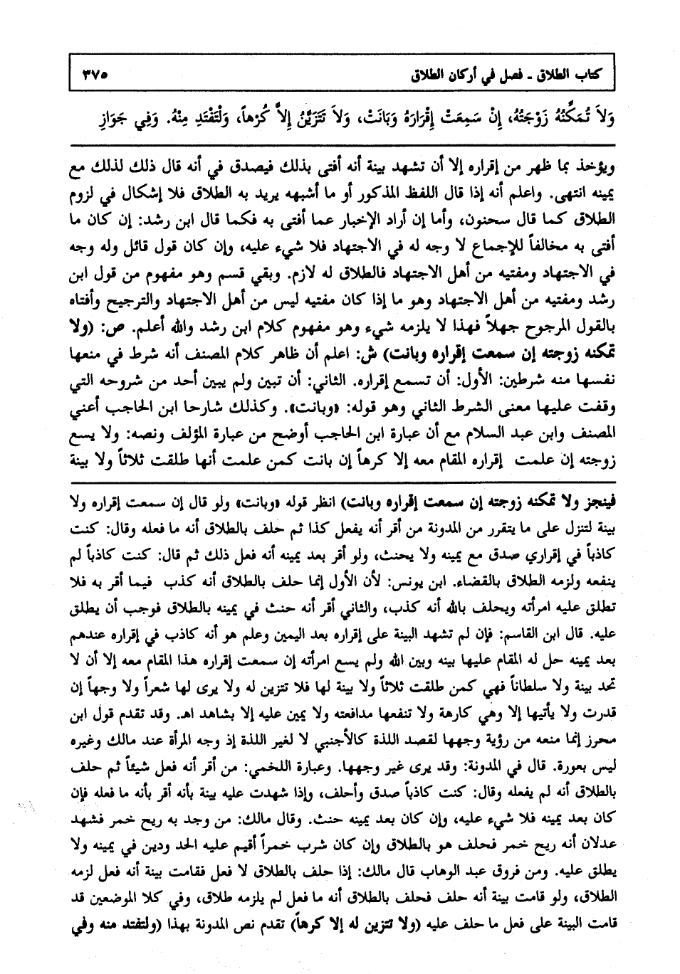 ويؤخذ بما ظهر من إقراره إلا أن تشهد بينة أنه أفتى بذلك فيصدق في أنه قال: ذلك لذلك مع يمينه انتهى. واعلم أنه إذا قال اللفظ المذكور أو ما أشبهه يريد به الطلاق فلا إشكال في لزوم الطلاق كما قال سحنون: وأما إن أراد الإخبار عما أفتى به فكما قال ابن رشد: إن كان ما أفتى به مخالفا للإجماع لا وجه له في الاجتهاد فلا شيء عليه وإن كان قول قائل وله وجه في الاجتهاد ومفتيه من أهل الاجتهاد فالطلاق له لازم وبقي قسم وهو مفهوم من قول ابن رشد ومفتيه من أهل الاجتهاد وهو ما إذا كان مفتيه ليس من أهل الاجتهاد والترجيح وأفتاه بالقول المرجوح جهلا فهذا لا يلزمه شيء وهو مفهوم كلام ابن رشد والله أعلم. ص: "ولا تمكنه زوجته إن سمعت إقراره وبانت" ش: اعلم أن ظاهر كلام المصنف أنه شرط في منعها نفسها منه شرطين الأول أن تسمع إقراره الثاني: أن تبين ولم يبين أحد من شروحه التي وقفت عليها معنى الشرط الثاني وهو قوله :و"بانت" وكذلك شارحا ابن الحاجب أعني المصنف وابن عبد السلام مع أن عبارة ابن الحاجب أوضح من عبارة المؤلف ونصه ولا يسع زوجته إن علمت إقراره المقام معه إلا كرها إن بانت كمن علمت أنها طلقت ثلاثا ولا بينة