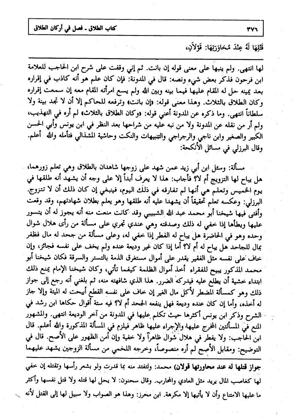 لها انتهى. ولم ينبها على معنى قوله إن بانت ثم إني وقفت على شرح ابن الحاجب للعلامة ابن فرحون فذكر بعض شيء ونصه قال في المدونة: فإن كان علم هو أنه كاذب في إقراره بعد يمينه حل له المقام عليها فيما بينه وبين الله ولم يسع امرأته المقام معه إن سمعت إقراره وكان الطلاق بالثلاث وهذا معنى قوله: "إن بانت" وترفعه للحاكم إلا أن لا تجد بينة ولا سلطانا انتهى. وما ذكره عن المدونة أعني قوله: "وكان الطلاق بالثلاث" لم أره في التهذيب ولم أر من نقله عن المدونة ولا من نبه عليه من شراحها بعد النظر في ابن يونس وأبي الحسن الكبير والصغير وابن ناجي والرجراجي والتنبيهات والنكت وحاشية المشذالي فتأمله والله أعلم. وقال البرزلي في مسائل الأنكحة.