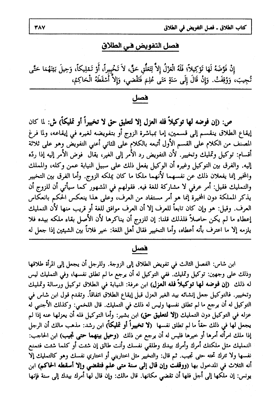 ص: "إن فوضه لها توكيلا فله العزل إلا لتعليق حق لا تخييرا أو تمليكا" ش: لما كان إيقاع الطلاق ينقسم إلى قسمين إما بمباشرة الزوج أو بتفويضه لغيره في إيقاعه ولما فرغ المصنف من الكلام على القسم الأول أتبعه بالكلام على الثاني أعني التفويض وهو على ثلاثة أقسام توكيل وتمليك وتخيير لأن التفويض رد الأمر إلى الغير يقال فوض الأمر إليه إذا رده إليه والفرق بين التوكيل وغيره أن الوكيل يفعل ذلك على سبيل النيابة عمن وكله والمملك والمخير إنما يفعلان ذلك عن نفسهما لأنهما ملكا ما كان يملكه الزوج وأما الفرق بين التخيير والتمليك فقيل أمر عرفي لا مشاركة للغة فيه فقولهم في المشهور كما سيأتي أن للزوج أن يذكر المملكة دون المخيرة إنما هو أمر مستفاد من العرف وعلى هذا ينعكس الحكم بانعكاس العرف وقيل هو وإن كان تابعا للعرف إلا أن العرف موافق للغة أو قريب منها لأن التمليك إعطاء ما لم يكن حاصلا فلذلك قلنا إن للزوج أن يناكرها لأن الأصل بقاء ملكه بيده فلا يلزمه إلا ما اعترف بأنه أعطاه وأما التخيير فقال أهل اللغة خير فلانا بين الشيئين إذا جعل له