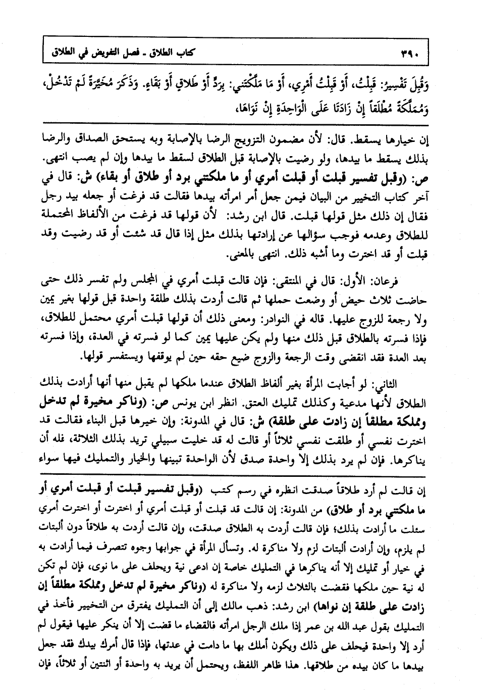 إن خيارها يسقط قال: لأن مضمون التزويج الرضا بالإصابة وبه يستحق الصداق والرضا بذلك يسقط ما بيدها ولو رضيت بالإصابة قبل الطلاق لسقط ما بيدها وإن لم يصب انتهى. ص: "وقبل تفسير قبلت أو قبلت أمري أو ما ملكتني برد أو طلاق أو بقاء" ش: قال: في آخر كتاب التخيير من البيان فيمن جعل أمر امرأته بيدها فقالت قد فرغت أو جعله بيد رجل فقال إن ذلك مثل قولها قبلت قال ابن رشد: لأن قولها قد فرغت من الألفاظ المحتملة للطلاق وعدمه فوجب سؤالها عن إرادتها بذلك مثل إذا قال قد شئت أو قد رضيت وقد قبلت أو قد اخترت وما أشبه ذلك انتهى. بالمعنى.
