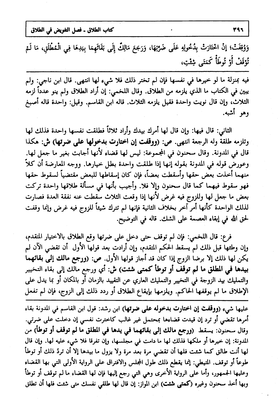 الثاني: قال فيها: وإن قال لها أمرك بيدك وأراد ثلاثا فطلقت نفسها واحدة فذلك لها وتلزمه طلقة وله الرجعة انتهى. ص: "ووقفت إن اختارت بدخولها على ضرتها" ش: هكذا قال في المدونة: وقال سحنون في المجموعة ليس لها قضاء لأنها أجابت بغير ما جعل لها وعورض قوله في المدونة بقوله إنها إذا طلقت واحدة بطل خيارها ووجه المعارضة أن كلا منهما أخذت بعض حقها وأسقطت بعضا فإن كان إسقاطها للبعض مقتضيا لسقوط حقها فهو سقوط فيهما كما قال سحنون: وإلا فلا وأجيب بأنها في مسألة طلاقها واحدة تركت بعض ما جعل لها وللزوج فيه غرض لأنها إذا وقعت الثلاث سقطت عنه نفقة العدة فصارت لذلك الواحدة كأنها أمر آخر بخلاف الثانية فإنها لم تترك شيئا للزوج فيه غرض وإنما وقفت لحق الله في إبقاء العصمة على الشك قاله في التوضيح.