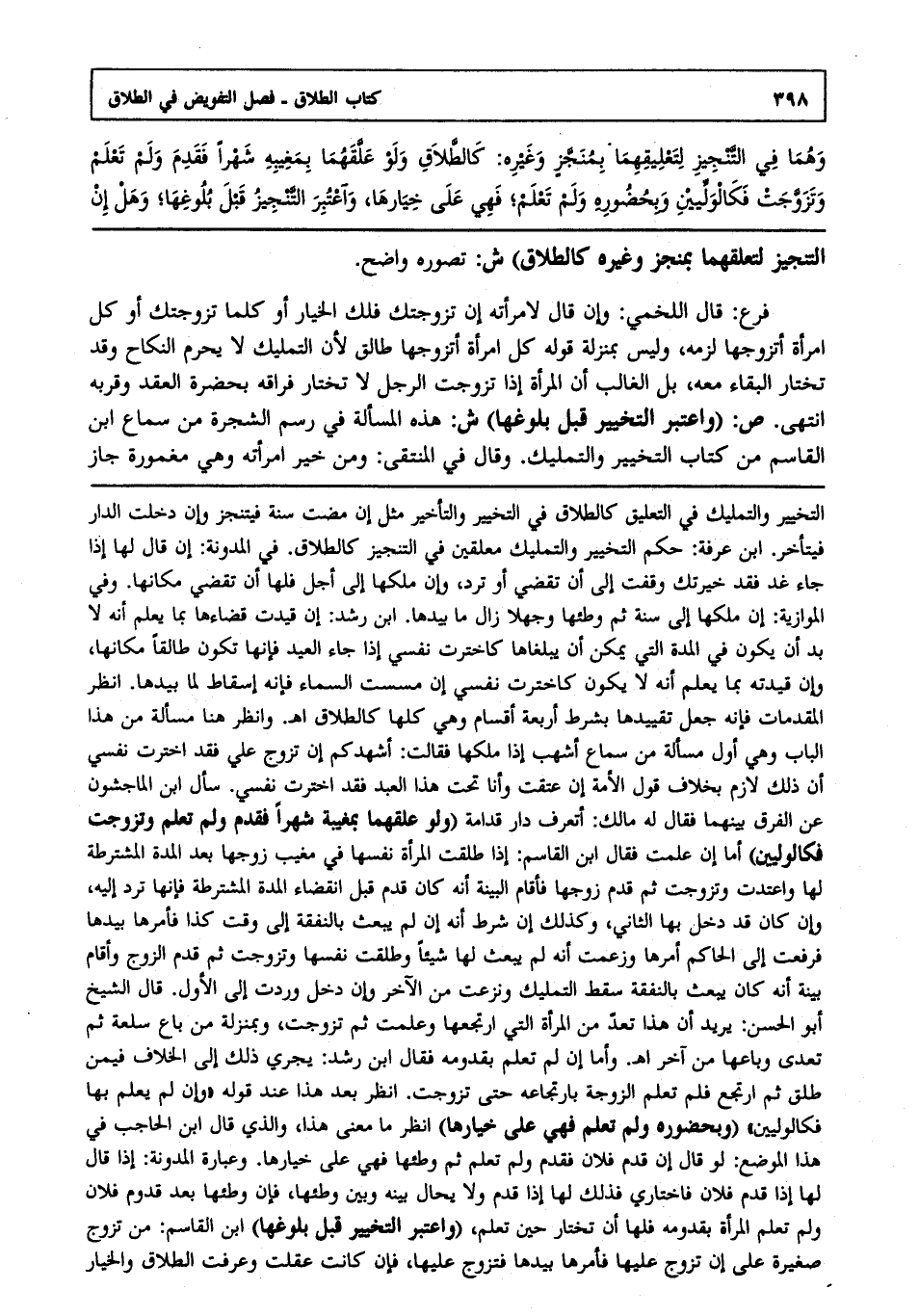 فرع: قال اللخمي: وإن قال لامرأته إن تزوجتك فلك الخيار أو كلما تزوجتك أو كل امرأة أتزوجها لزمه وليس بمنزلة قوله كل امرأة أتزوجها طالق لأن التمليك لا يحرم النكاح وقد تختار البقاء معه بل الغالب أن المرأة إذا تزوجت الرجل لا تختار فراقه بحضرة العقد وقربه انتهى. ص: "واعتبر التخيير قبل بلوغها" ش: هذه المسألة في رسم الشجرة من سماع ابن القاسم من كتاب التخيير والتمليك وقال في المنتقى: ومن خير امرأته وهي مغمورة جاز