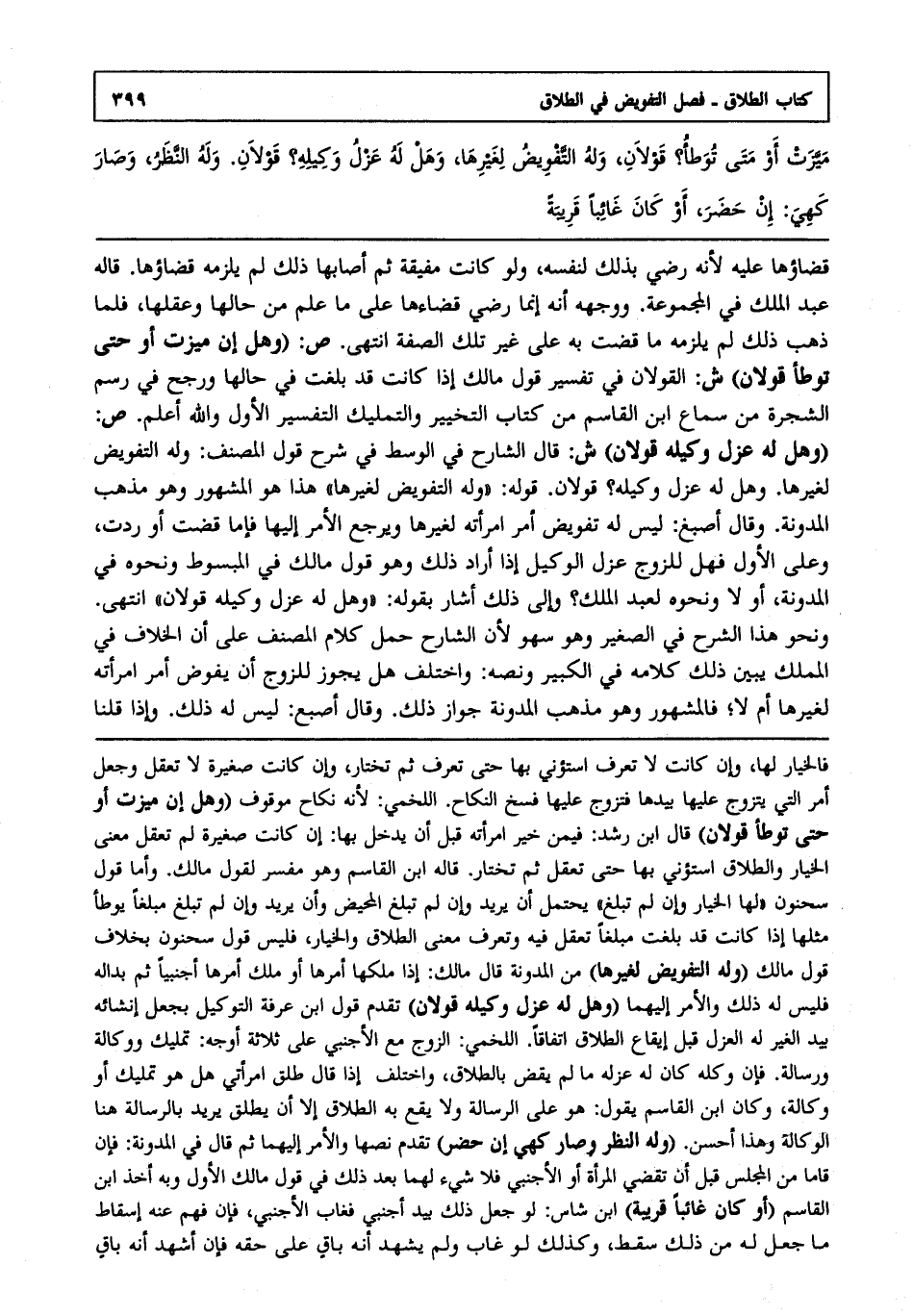 قضاؤها عليه لأنه رضي بذلك لنفسه ولو كانت مفيقة ثم أصابها ذلك لم يلزمه قضاؤها قاله عبد الملك في المجموعة ووجهه أنه إنما رضي قضاءها على ما علم من حالها وعقلها فلما ذهب ذلك لم يلزمه ما قضت به على غير تلك الصفة انتهى. ص: "وهل إن ميزت أو حتى توطأ قولان" ش: القولان في تفسير قول مالك إذا كانت قد بلغت في حالها ورجح في رسم الشجرة من سماع ابن القاسم من كتاب التخيير والتمليك التفسير الأول والله أعلم. ص: "وهل له عزل وكيله قولان" ش: قال: الشارح في الوسط في شرح قول المصنف وله التفويض لغيرها وهل له عزل وكيله؟ قولان قوله: "وله التفويض لغيرها" هذا هو المشهور وهو مذهب المدونة وقال أصبغ ليس له تفويض أمر امرأته لغيرها ويرجع الأمر إليها فإما قضت أو ردت وعلى الأول فهل للزوج عزل الوكيل إذا أراد ذلك وهو قول مالك في المبسوط ونحوه في المدونة أو لا ونحوه لعبد الملك؟ وإلى ذلك أشار بقوله وهل له عزل وكيله قولان انتهى. ونحو هذا الشرح في الصغير وهو أخذها لأن الشارح حمل كلام المصنف على أن الخلاف في المملك يبين ذلك كلامه في الكبير ونصه واختلف هل يجوز للزوج أن يفوض أمر امرأته لغيرها أم لا فالمشهور وهو مذهب المدونة جواز ذلك وقال أصبغ ليس له ذلك وإذا قلنا