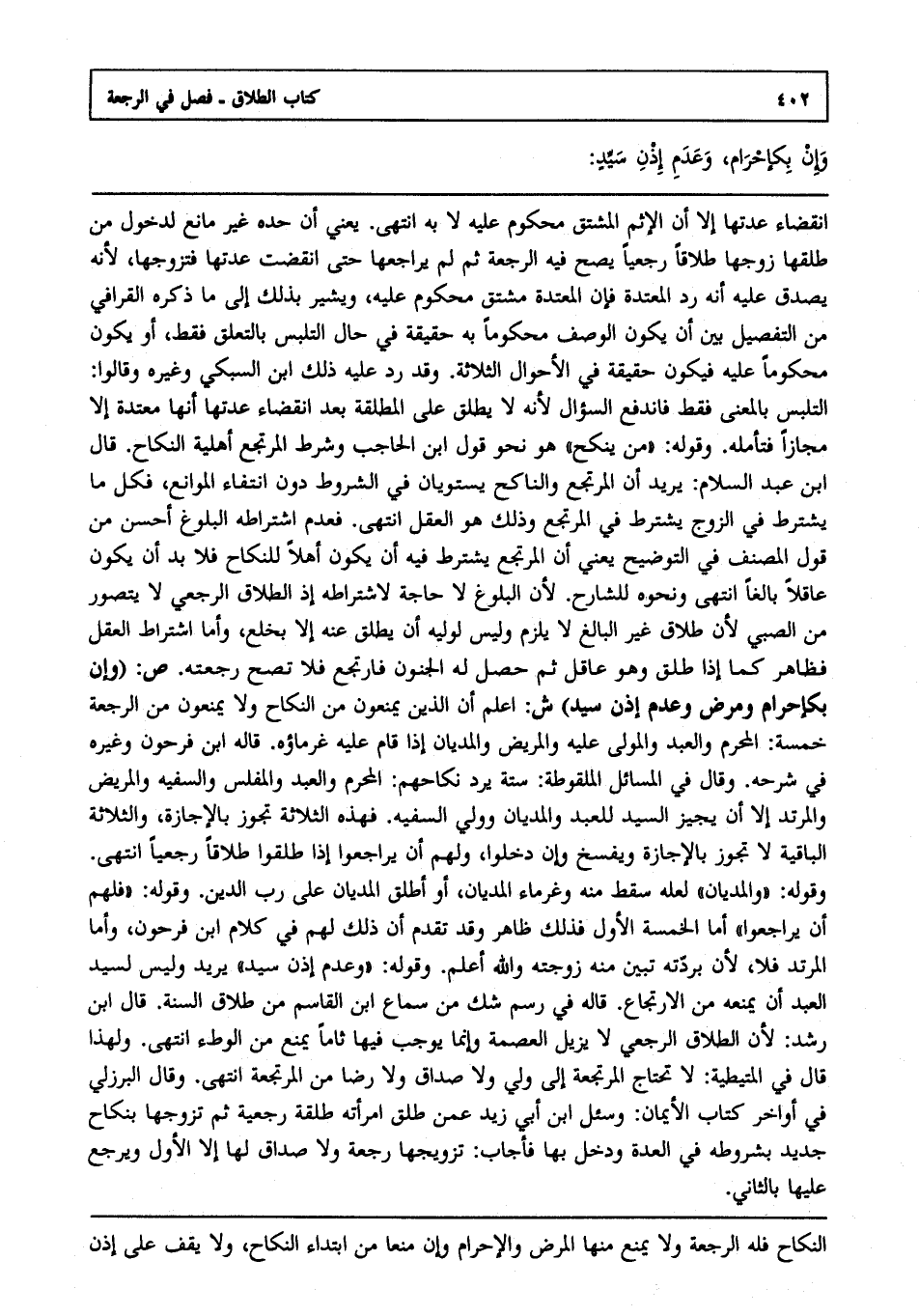 انقضاء عدتها إلا أن الإثم المشتق محكوم عليه لا به انتهى. يعني أن حده غير مانع لدخول من طلقها زوجها طلاقا رجعيا يصح فيه الرجعة ثم لم يراجعها حتى انقضت عدتها فتزوجها لأنه يصدق عليه أنه رد المعتدة فإن المعتدة مشتق محكوم عليه ويشير بذلك إلى ما ذكره القرافي من التفصيل بين أن يكون الوصف محكوما به حقيقة في حال التلبس بالتعلق فقط أو يكون محكوما عليه فيكون حقيقة في الأحوال الثلاثة وقد رد عليه ذلك ابن السبكي وغيره وقالوا التلبس بالمعنى فقط فاندفع السؤال لأنه لا يطلق على المطلقة بعد انقضاء عدتها أنها معتدة إلا مجازا فتأمله وقوله: "من ينكح" هو نحو قول ابن الحاجب وشرط المرتجع أهلية النكاح قال ابن عبد السلام: يريد أن المرتجع والناكح يستويان في الشروط دون انتفاء الموانع فكل ما يشترط في الزوج يشترط في المرتجع وذلك هو العقل انتهى. فعدم اشتراطه البلوغ أحسن من قول المصنف في التوضيح يعني أن المرتجع يشترط فيه أن يكون أهلا للنكاح فلا بد أن يكون عاقلا بالغا انتهى. ونحوه للشارح لأن البلوغ لا حاجة لاشتراطه إذ الطلاق الرجعي لا يتصور من الصبي لأن طلاق غير البالغ لا يلزم وليس لوليه أن يطلق عنه إلا بخلع وأما اشتراط العقل فظاهر كما إذا طلق وهو عاقل ثم حصل له الجنون فارتجع فلا تصح رجعته ص: "وإن بكإحرام ومرض وعدم إذن سيد" ش: اعلم أن الذين يمنعون من النكاح ولا يمنعون من الرجعة خمسة المحرم والعبد والمولى عليه والمريض والمديان إذا قام عليه غرماؤه قاله ابن فرحون وغيره في شرحه وقال في المسائل الملقوطة ستة يرد نكاحهم المحرم والعبد والمفلس والسفيه والمريض والمرتد إلا أن يجيز السيد للعبد والمديان وولي السفيه فهذه الثلاثة تجوز بالإجازة والثلاثة الباقية لا تجوز بالإجازة ويفسخ وإن دخلوا ولهم أن يراجعوا إذا طلقوا طلاقا رجعيا انتهى. وقوله: "والمديان" لعله سقط منه وغرماء المديان أو أطلق المديان على رب الدين وقوله: "فلهم أن يراجعوا" أما الخمسة الأول فذلك ظاهر وقد تقدم أن ذلك لهم في كلام ابن فرحون وأما المرتد فلا لأن بردته تبين منه زوجته والله أعلم. وقوله: "وعدم إذن سيد" يريد وليس لسيد العبد أن يمنعه من الارتجاع قاله في رسم شك من سماع ابن القاسم من طلاق السنة قال ابن رشد: لأن الطلاق الرجعي لا يزيل العصمة وإنما يوجب فيها ثاما يمنع من الوطء انتهى. ولهذا قال: في المتيطية لا تحتاج المرتجعة إلى ولي ولا صداق ولا رضا من المرتجعة انتهى. وقال البرزلي في أواخر كتاب الأيمان وسئل ابن أبي زيد عمن طلق امرأته طلقة رجعية ثم تزوجها بنكاح جديد بشروطه في العدة ودخل بها فأجاب تزويجها رجعة ولا صداق لها إلا الأول ويرجع عليها بالثاني.