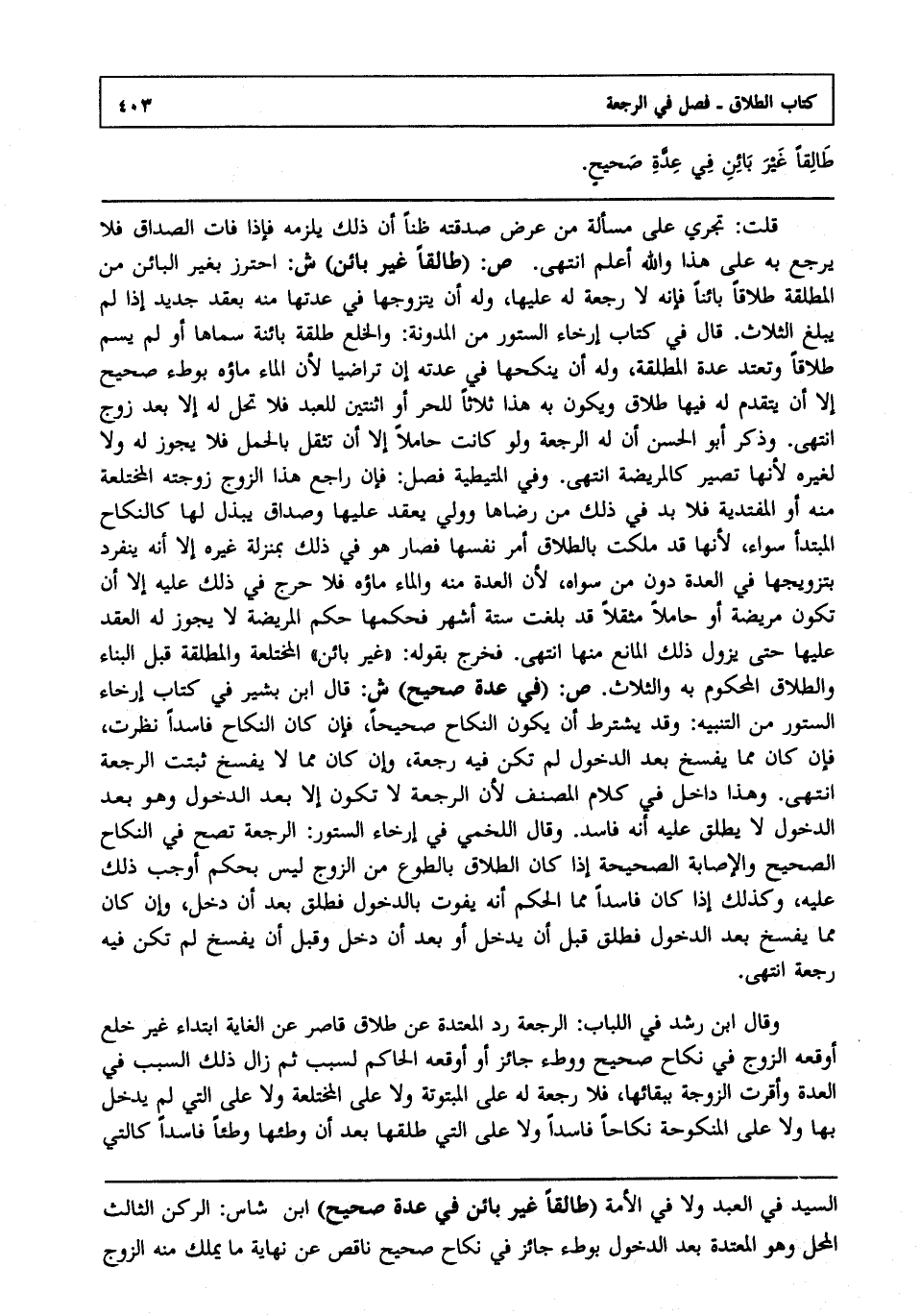وقال ابن رشد في اللباب: الرجعة رد المعتدة عن طلاق قاصر عن الغاية ابتداء غير خلع أوقعه الزوج في نكاح صحيح ووطء جائز أو أوقعه الحاكم لسبب ثم زال ذلك السبب في العدة وأقرت الزوجة ببقائها فلا رجعة له على المبتوتة ولا على المختلعة ولا على التي لم يدخل بها ولا على المنكوحة نكاحا فاسدا ولا على التي طلقها بعد أن وطئها وطئا فاسدا كالتي