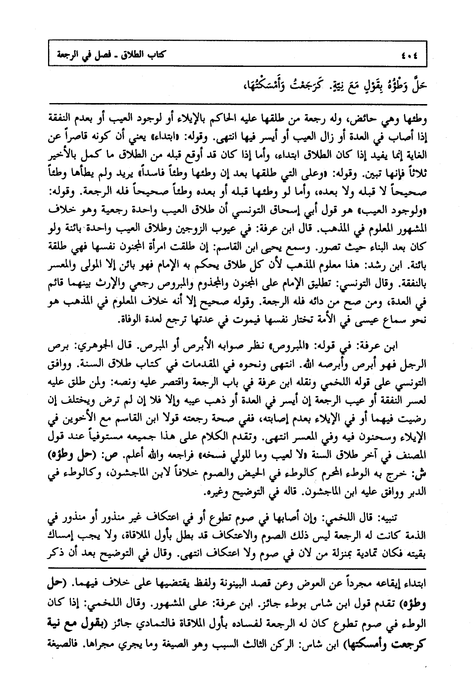 ابن عرفة: في قوله: "المبروص" نظر صوابه الأبرص أو المبرص قال الجوهري: برص الرجل فهو أبرص وأبرصه الله انتهى. ونحوه في المقدمات في كتاب طلاق السنة ووافق التونسي على قوله اللخمي ونقله ابن عرفة في باب الرجعة واقتصر عليه ونصه ولمن طلق عليه لعسر النفقة أو عيب الرجعة إن أيسر في العدة أو ذهب عيبه وإلا فلا إن لم ترض ويختلف إن رضيت فيهما أو في الإيلاء بعدم إصابته ففي صحة رجعته قولا ابن القاسم مع الأخوين في الإيلاء وسحنون فيه وفي المعسر انتهى. وتقدم الكلام على هذا جميعه مستوفيا عند قول المصنف في آخر طلاق السنة "لا لعيب وما للولي فسخه" فراجعه والله أعلم. ص: "حل وطؤه" ش: خرج به الوطء المحرم كالوطء في الحيض والصوم خلافا لابن الماجشون وكالوطء في الدبر ووافق عليه ابن الماجشون قاله في التوضيح وغيره.