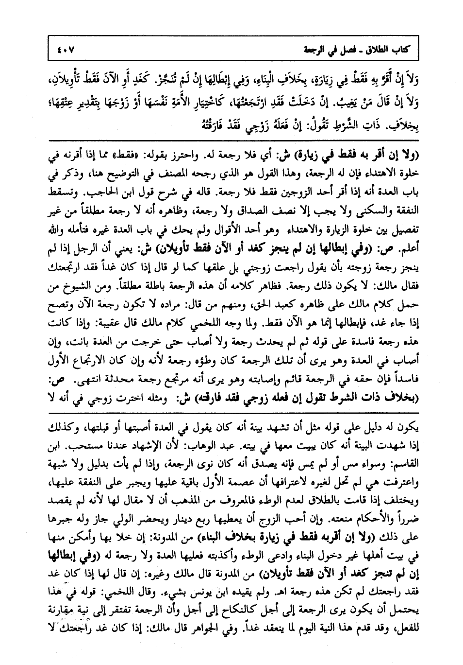 ولا إن أقر به فقد في زيادة بخلاف البناء، وفي إبطالها إن لم تنجز كغد أو الآن فقط تأويلان، ولا إن قال من يغيب إن دخلت فقد ارتجعتها كاختيار الأمة نفسها أو زوجها بتقدير عتقها بخلاف ذ ات الشرط تقول إن فعله زوجي فقد فارقته
