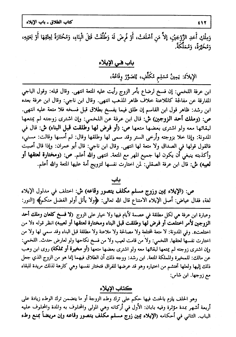 ص الإيلاء يمين وزوج مسلم مكلف يتصور وقاعه" ش: اختلف في مدلول الإيلاء لغة فقال عياض: أصل الإيلاء الامتناع قال الله تعالى: {وَلا يَأْتَلِ أُولُو الْفَضْلِ مِنْكُمْ} النور: