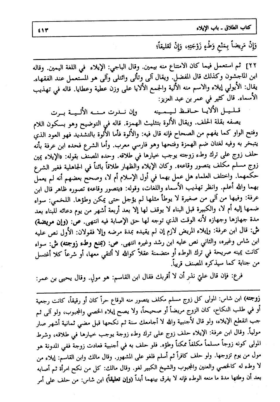 يصفه بقلة الحلف ويقال الألوة بتثليث الهمزة قاله في التوضيح وهو بسكون اللام وفتح الواو كما يفهم من الصحاح فإنه قال فيه والألوة فأما الألوة بالتشديد فهو العود الذي يتبخر به وفيه لغتان ضم الهمزة وفتحها وهو فارسي معرب وأما الشرع فحده ابن عرفة بأنه حلف زوج على ترك وطء زوجته يوجب خيارها في طلاقه وحده المصنف بقوله: "الإيلاء يمين زوج مسلم مكلف يتصور وقاعه" وكان الإيلاء والظهار طلاقا بائنا في الجاهلية فغير الشرع حكمهما واختلف العلماء هل عمل بهما في أول الإسلام أم لا وصحح بعضهم أنه لم يعمل بهما والله أعلم. وانظر تهذيب الأسماء واللغات وقوله: "يتصور وقاعه" تصوره ظاهر قال ابن عرفة: وفيها من آلى من صغيرة لا يوطأ مثلها لم يؤجل حتى يمكن وطؤها اللخمي سواء ضمها إليه أم لا والكبيرة قبل البناء لا يوقف لها إلا بعد أربعة أشهر من يوم دعائه للبناء بعد مدة جهازها وجهازه لأنه الوقت الذي توجه لها حق الإصابة فيه انتهى. ص: "وإن مريضة" ش: قال ابن عرفة: وإيلاء المريض لازم إن لم يقيده بمدة مرضه وإلا فقولان الأول نص عليه ابن شاس وغيره والثاني نص عليه ابن رشد وغيره انتهى. ص: "بمنع وطء زوجته" ش: سواء كانت يمينه صريحة في ترك الوطء أو متضمنة عقلا كوالله لا ألتقي معها أو شرعا كلا أغتسل من جنابة كما سيذكره المصنف قريبا.