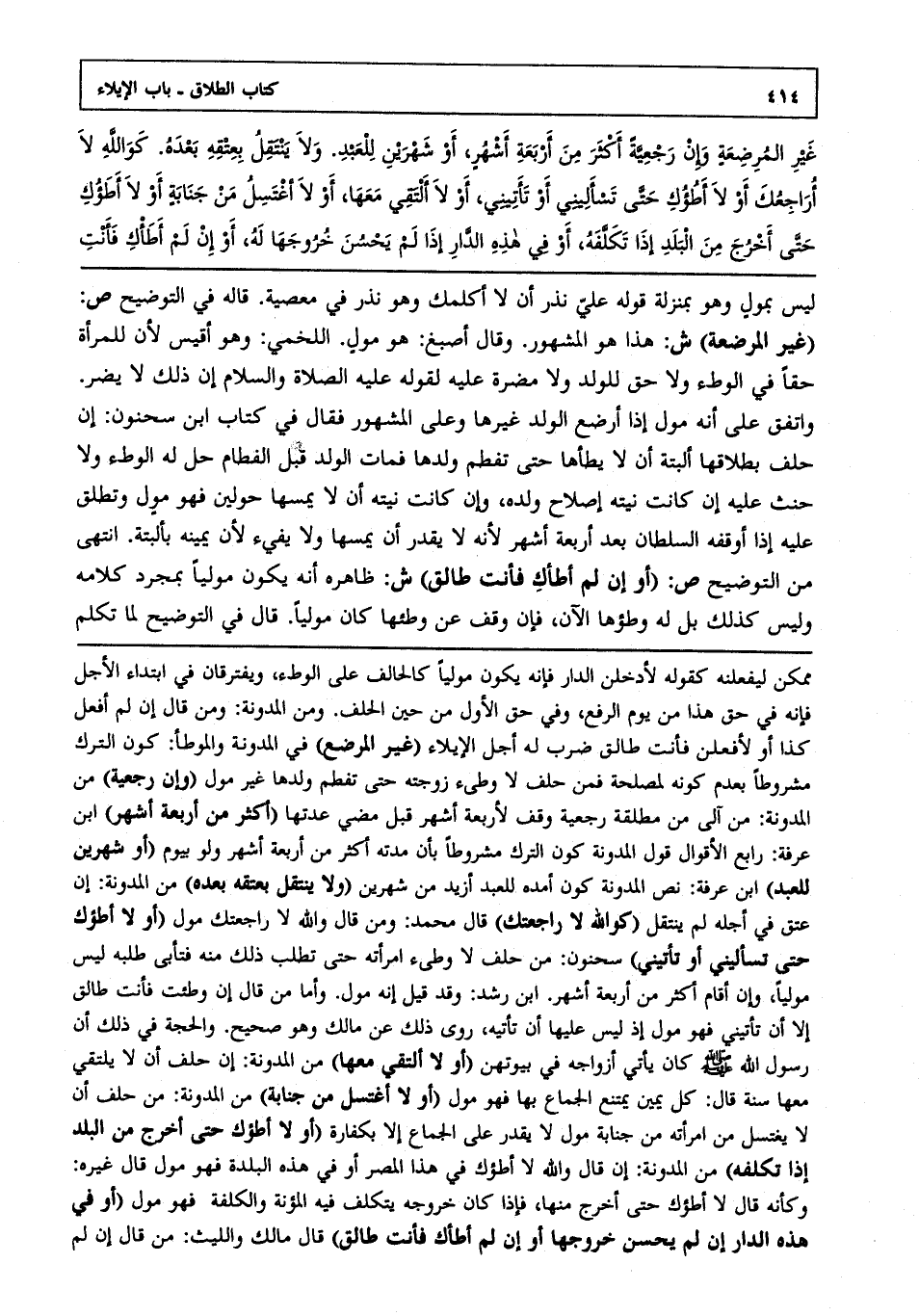 غير المرضعة وإن رجعية أكثر من أربعة أشهر، أو شهرين للعبد، ولا ينتقل بعتقه بعده كوالله لا أراجعك أو لا أطؤك حتى تسأليني أو تأتيني، أو لا ألتقي معها، أو لا أغتسل من جنابة، أو لا أطؤك حتى أخرج من البلد إذا تكلفه، أو في هذه الدار إذا لم يحسن خروجها له، أو إن لم أطأك فأنت