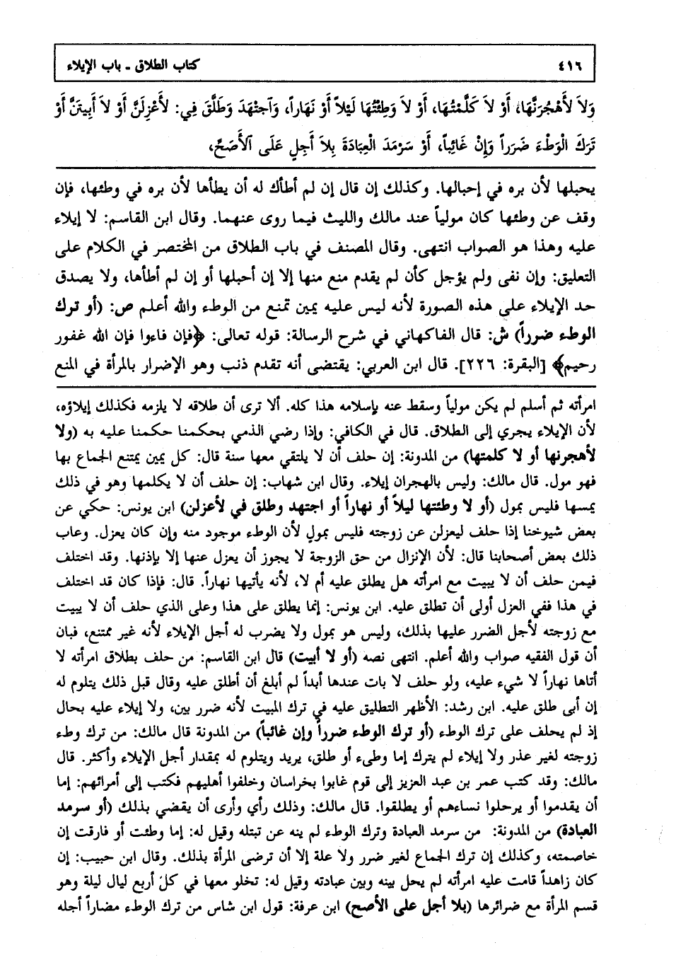 يحبلها لأن بره في إحبالهاوكذلك إن قال إن لم أطأك له أن يطأها لأن بره في وطئها فإن وقف عن وطئها كان موليا عند مالك والليث فيما روى عنهما وقال ابن القاسم: لا إيلاء عليه وهذا هو الصواب انتهى. وقال المصنف في باب الطلاق من المختصر في الكلام على التعليق: وإن نفى ولم يؤجل كأن لم يقدم منع منها إلا إن أحبلها أو إن لم أطأها ولا يصدق حد الإيلاء على هذه الصورة لأنه ليس عليه يمين تمنع من الوطء والله أعلم.ص: "أو ترك الوطء ضررا" ش: قال الفاكهاني في شرح الرسالة قوله تعالى: {فَإِنْ فَاءُوا فَإِنَّ اللَّهَ غَفُورٌ رَحِيمٌ} البقرةقال ابن العربي: يقتضى أنه تقدم ذنب وهو الإضرار بالمرأة في المنع