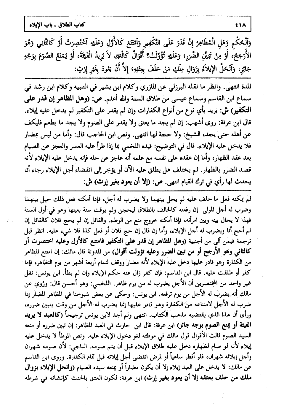 والحكم وهل المظاهر إن قدر على التكفير وامتنع كالأول وعليه اختصرت أو كالثاني وهو الأرجح، أو من تبين الضرر، وعليه تؤولت؟ أقوال كالعبد لا يريد الفيئة، أو يمنع الصوم بوجه جائز، وانحل الإيلاء بزوال ملك من حلف بعتقه ؛ إلا أن يعود بغير إرث: