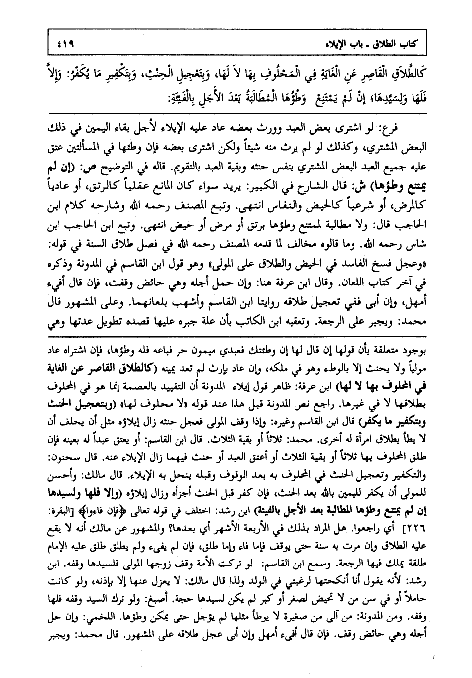 فرع: لو اشترى بعض العبد وورث بعضه عاد عليه الإيلاء لأجل بقاء اليمين في ذلك البعض المشتري وكذلك لو لم يرث منه شيئا ولكن اشترى بعضه فإن وطئها في المسألتين عتق عليه جميع العبد البعض المشتري بنفس حنثه وبقية العبد بالتقويمقاله في التوضيح ص: "إن لم يمتنع وطؤها" ش: قال الشارح في الكبير: يريد سواء كان المانع عقليا كالرتق أو عاديا كالمرض أو شرعيا كالحيض والنفاس انتهى. وتبع المصنف رحمه الله وشارحه كلام ابن الحاجب قال: ولا مطالبة لممتنع وطؤها برتق أو مرض أو حيض انتهى. وتبع ابن الحاجب ابن شاس رحمه الله وما قالوه مخالف لما قدمه المصنف رحمه الله في فصل طلاق السنة في قوله: "وعجل فسخ الفاسد في الحيض والطلاق على المولى" وهو قول ابن القاسم في المدونة: وذكره في آخر كتاب اللعان وقال ابن عرفة هنا وإن حمل أجله وهي حائض وقفت فإن قال أفيء أمهل وإن أبى ففي تعجيل طلاقه روايتا ابن القاسم وأشهب بلعانهما وعلى المشهور قال محمد ويجبر على الرجعة وتعقبه ابن الكاتب بأن علة جبره عليها قصده تطويل عدتها وهي