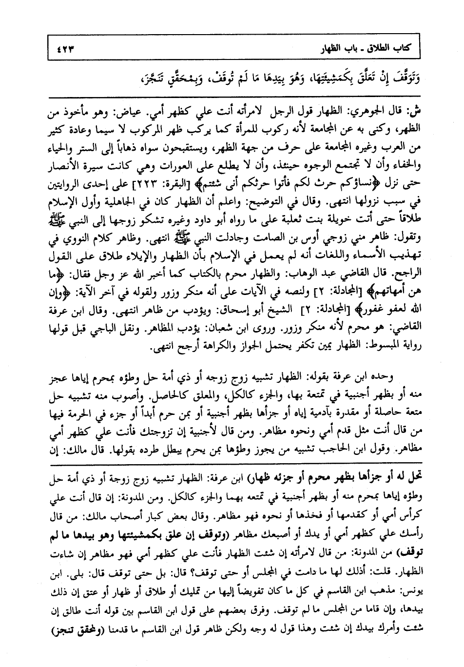 ش: قال الجوهري: الظهار قول الرجل لامرأته أنت علي كظهر أمي عياض وهو مأخوذ من الظهر وكنى به عن المجامعة لأنه ركوب للمرأة كما يركب ظهر المركوب لا سيما وعادة كثير من العرب وغيره المجامعة على حرف من جهة الظهر ويستقبحون سواه ذهابا إلى الستر والحياء والخفاء وأن لا تجتمع الوجوه حينئذ وأن لا يطلع على العورات وهي كانت سيرة الأنصار حتى نزل {نِسَاؤُكُمْ حَرْثٌ لَكُمْ فَأْتُوا حَرْثَكُمْ أَنَّى شِئْتُمْ} على إحدى الروايتين في سبب نزولها انتهى. وقال في التوضيح: واعلم أن الظهار كان في الجاهلية وأول الإسلام طلاقا حتى أتت خويلة بنت ثعلبة على ما رواه أبو داود وغيره تشكو زوجها إلى النبي صلى الله عليه وسلم وتقول ظاهر مني زوجي أوس بن الصامت وجادلت النبي صلى الله عليه وسلم انتهى. وظاهر كلام النووي في تهذيب الأسماء واللغات أنه لم يعمل في الإسلام بأن الظهار والإيلاء طلاق على القول الراجح قال القاضي عبد الوهاب والظهار محرم بالكتاب كما أخبر الله عز وجل فقال: {مَا هُنَّ أُمَّهَاتِهِمْ} ولنصه في الآيات على أنه منكر وزور ولقوله في آخر الآية {وَإِنَّ اللَّهَ لَعَفُوٌّ غَفُورٌ} الشيخ أبو إسحاق ويؤدب من ظاهر انتهى. وقال ابن عرفة القاضي هو محرم لأنه منكر وزور وروى ابن شعبان يؤدب المظاهر ونقل الباجي قبل قولها رواية المبسوط الظهار يمين تكفر يحتمل الجواز والكراهة أرجح انتهى.