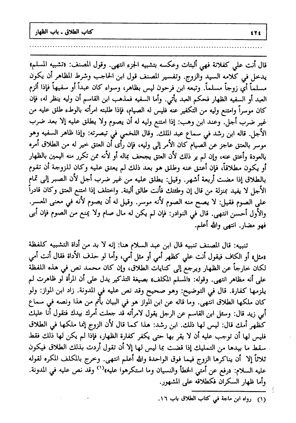 قال أنت علي كفلانة فهي ألبتات وعكسه بتشبيه الجزء انتهى. وقول المصنف: "تشبيه المسلم" يدخل في كلامه السيد والزوج وتفسير المصنف قول ابن الحاجب وشرط المظاهر أن يكون مسلما أي زوجا مسلما وتبعه ابن فرحون ليس بظاهر وسواء كان عبدا أو سفيها فإذا ألزم العبد أو السفيه الظهار فحكم العبد يأتي وأما السفيه فمذهب ابن القاسم أن وليه ينظر له فإن كان موسرا وامتنع وليه من التكفير عنه فليس له الصيام فإذا طلبته امرأته بالوطء طلق عليه من غير ضرب أجل وعند ابن وهب إذا امتنع وليه له أن يصوم ولا يطلق عليه إلا بعد ضرب الأجل قاله ابن رشد في سماع عبد الملك وقال اللخمي: في تبصرته وإذا ظاهر السفيه وهو موسر بالعتق عاجز عن الصيام كان الأمر إلى وليه فإن رأى أن العتق خير له من الطلاق أمره بالعودة وأعتق عنه وإن لم ير ذلك لأن العتق يجحف بماله أو لأنه ممن تكرر منه اليمين بالظهار أو يكون مطلاقا فإن أعتق عنه وطلق هو بعد ذلك لم يعتق عليه وكان للزوجة أن تقوم بالطلاق إذا مضت أربعة أشهر وقيل يطلق عليه من غير ضرب أجل لأن الصبر إلى تمام الأجل لا يفيد بمنزلة من قال إن وطئتك فأنت طالق ألبتة واختلف إذا امتنع العتق وكان قادرا على الصوم فقيل لا يصح منه الصوم لأنه موسر وقيل له أن يصوم لأنه في معنى المعسر والأول أحسن انتهى. قال في النوادر فإن لم يكن له مال صام ولا يمنع من الصوم فإن أبى فهو مضار انتهى. والله أعلم.