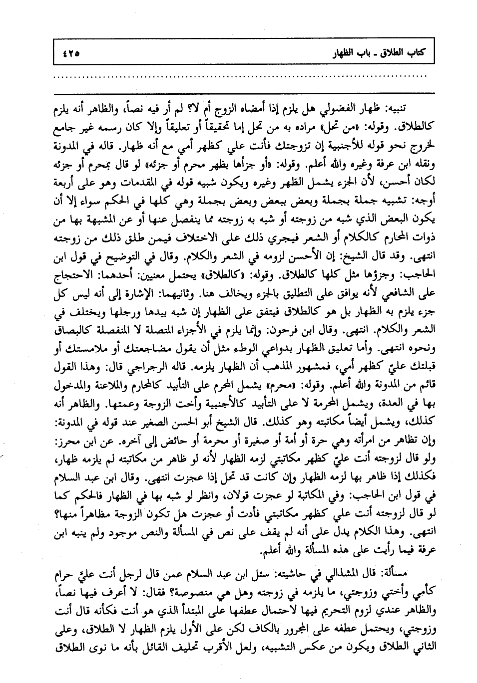مسألة: قال المشذالي في حاشيته: سئل ابن عبد السلام عمن قال لرجل أنت علي حرام كأمي وأختي وزوجتي ما يلزمه في زوجته وهل هي منصوصة فقال لا أعرف فيها نصا والظاهر عندي لزوم التحريم فيها لاحتمال عطفها على المبتدأ الذي هو أنت فكأنه قال أنت وزوجتي ويحتمل عطفه على المجرور بالكاف لكن على الأول يلزم الظهار لا الطلاق وعلى الثاني الطلاق ويكون من عكس التشبيه ولعل الأقرب تحليف القائل بأنه ما نوى الطلاق