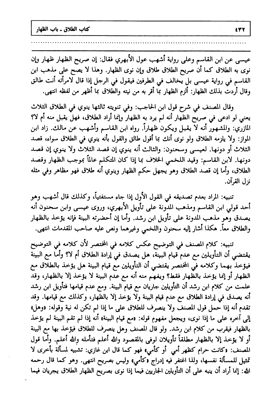 عِيسَى عَنْ ابْنِ الْقَاسِمِ، وَعَلَى رِوَايَةِ أَشْهَبَ عَوَّلَ الْأَبْهَرِيُّ فَقَالَ: إنَّ صَرِيحَ الظِّهَارِ ظِهَارٌ، وَإِنْ نَوَى بِهِ الطَّلَاقَ كَمَا أَنَّ صَرِيحَ الطَّلَاقِ طَلَاقٌ، وَإِنْ نَوَى الظِّهَارَ، وَهَذَا لَا يَصِحُّ عَلَى مَذْهَبِ ابْنِ الْقَاسِمِ فِي رِوَايَةِ عِيسَى بَلْ يُخَالِفُ فِي الطَّرَفَيْنِ، فَيَقُولُ فِي الرَّجُلِ إذَا قَالَ لِامْرَأَتِهِ أَنْتِ طَالِقٌ، وَقَالَ أَرَدْتُ بِذَلِكَ الظِّهَارَ أُلْزِمَ الظِّهَارَ بِمَا أَقَرَّ بِهِ مِنْ نِيَّتِهِ، وَالطَّلَاقُ بِمَا أَظْهَرَ مِنْ لَفْظِهِ انتهى.