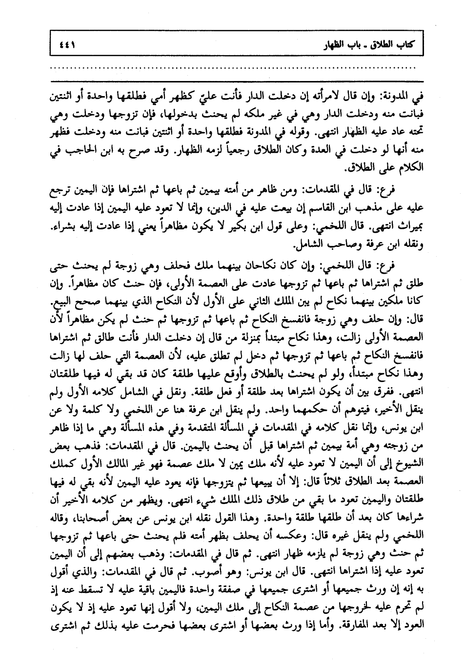 فرع: قال اللخمي: وإن كان نكاحان بينهما ملك فحلف وهي زوجة لم يحنث حتى طلق ثم اشتراها ثم باعها ثم تزوجها عادت على العصمة الأولى فإن حنث كان مظاهرا وإن كانا ملكين بينهما نكاح لم يبن الملك الثاني على الأول لأن النكاح الذي بينهما صحح البيع قال وإن حلف وهي زوجة فانفسخ النكاح ثم باعها ثم تزوجها ثم حنث لم يكن مظاهرا لأن العصمة الأولى زالت وهذا نكاح مبتدأ بمنزلة من قال إن دخلت الدار فأنت طالق ثم اشتراها فانفسخ النكاح ثم باعها ثم تزوجها ثم دخل لم تطلق عليه لأن العصمة التي حلف لها زالت وهذا نكاح مبتدأ ولو لم يحنث بالطلاق وأوقع عليها طلقة كان قد بقي له فيها طلقتان انتهى. ففرق بين أن يكون اشتراها بعد طلقة أو فعل طلقة ونقل في الشامل: كلامه الأول ولم ينقل الأخير فيتوهم أن حكمهما واحد ولم ينقل ابن عرفة هنا عن اللخمي ولا كلمة ولا عن ابن يونس وإنما نقل كلامه في المقدمات في المسألة المتقدمة وفي هذه المسألة وهي ما إذا ظاهر من زوجته وهي أمة بيمين ثم اشتراها قبل أن يحنث باليمين قال في المقدمات: فذهب بعض الشيوخ إلى أن اليمين لا تعود عليه لأنه ملك يمين لا ملك عصمة فهو غير المالك الأول كملك العصمة بعد الطلاق ثلاثا قال إلا أن يبيعها ثم يتزوجها فإنه يعود عليه اليمين لأنه بقي له فيها طلقتان واليمين تعود ما بقي من طلاق ذلك الملك شيء انتهى. ويظهر من كلامه الأخير أن شراءها كان بعد أن طلقها طلقة واحدة وهذا القول نقله ابن يونس عن بعض أصحابنا وقاله اللخمي ولم ينقل غيره قال وعكسه أن يحلف بظهر أمته فلم يحنث حتى باعها ثم تزوجها ثم حنث وهي زوجة لم يلزمه ظهار انتهى. ثم قال في المقدمات وذهب بعضهم إلى أن اليمين تعود عليه إذا اشتراها انتهى. قال ابن يونس وهو أصوب ثم قال في المقدمات والذي أقول به إنه إن ورث جميعها أو اشترى جميعها في صفقة واحدة فاليمين باقية عليه لا تسقط عنه إذ لم تحرم عليه لخروجها من عصمة النكاح إلى ملك اليمين ولا أقول إنها تعود عليه إذ لا يكون العود إلا بعد المفارقة وأما إذا ورث بعضها أو اشترى بعضها فحرمت عليه بذلك ثم اشترى