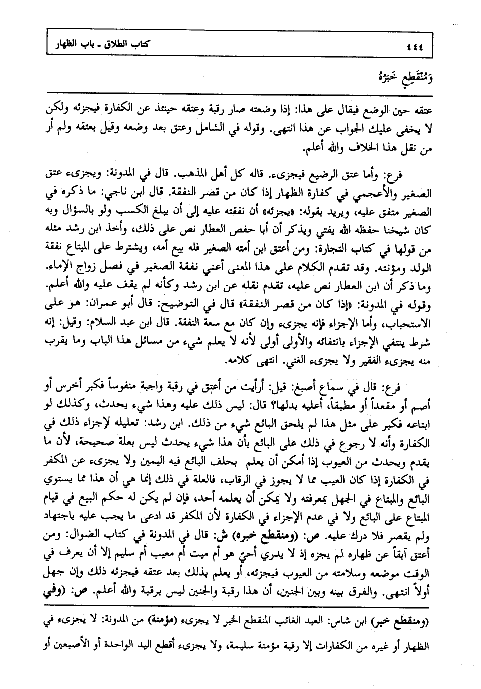 فرع: قال في سماع أصبغ: قيل أرأيت من أعتق في رقبة واجبة منفوسا فكبر أخرس أو أصم أو مقعدا أو مطبقا أعليه بدلها قال ليس ذلك عليه وهذا شيء يحدث وكذلك لو ابتاعه فكبر على مثل هذا لم يلحق البائع شيء من ذلك ابن رشد تعليله لإجزاء ذلك في الكفارة وأنه لا رجوع في ذلك على البائع بأن هذا شيء يحدث ليس بعلة صحيحة لأن ما يقدم ويحدث من العيوب إذا أمكن أن يعلم بحلف البائع فيه اليمين ولا يجزئ عن المكفر في الكفارة إذا كان العيب مما لا يجوز في الرقاب فالعلة في ذلك إنما هي أن هذا مما يستوي البائع والمبتاع في الجهل بمعرفته ولا يمكن أن يعلمه أحد فإن لم يكن له حكم البيع في قيام المبتاع على البائع ولا في عدم الإجزاء في الكفارة لأن المكفر قد ادعى ما يجب عليه باجتهاد ولم يقصر فلا درك عليه ص: "ومنقطع خبره" ش: قال في المدونة: في كتاب الضوال: ومن أعتق آبقا عن ظهاره لم يجزه إذ لا يدري أحي هو أم ميت أم معيب أم سليم إلا أن يعرف في الوقت موضعه وسلامته من العيوب فيجزئه أو يعلم بذلك بعد عتقه فيجزئه ذلك وإن جهل أولا انتهى. والفرق بينه وبين الجنين أن هذا رقبة والجنين ليس برقبة والله أعلم. ص: "وفي