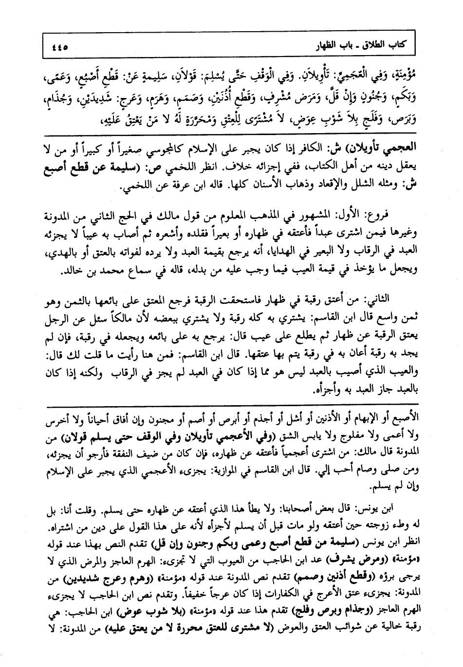 العجمي تأويلان" ش: الكافر إذا كان يجبر على الإسلام كالمجوسي صغيرا أو كبيرا أو من لا يعقل دينه من أهل الكتاب ففي إجزائه خلاف انظر اللخمي ص: "سليمة عن قطع أصبع" ش: ومثله الشلل والإقعاد وذهاب الأسنان كلها قاله ابن عرفة عن اللخمي.