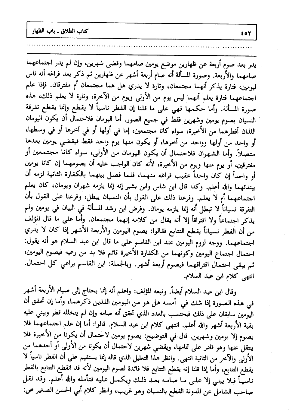 وقال ابن عبد السلام أيضا: وتبعه المؤلف: واعلم أنه إنما يحتاج إلى صيام الأربعة أشهر في هذه الصورة إذا شك في أمسه هل هو من اليومين اللذين ذكرهما وأما إن تحقق أن اليومين سابقان على ذلك فيحتسب بالعدد الذي تحقق أنه صامه وإن لم يتخلله فطر ويبني عليه بقية الأربعة أشهر والله أعلم.انتهى كلام ابن عبد السلام قالوا أما إن علم اجتماعهما فلا يصوم إلا يومين وشهرين قال في التوضيح: يصوم يومين لاحتمال أن يكونا من الأخيرة فلا ينتقل عنها وهو قادر على تمامها ويقضي شهرين لاحتمال أن يكونا من الأولى أو أحدهما من الأولى والآخر من الثانية انتهى. وانظر هذا التعليل الذي قاله إنما يستقيم على أن الفطر ناسيا لا يقطع التتابع وأما إذا قلنا إنه يقطع التتابع فلا فائدة لصوم اليومين لأنه قد انقطع التتابع بالفطر ناسيا فلا يبني إلا على ما صامه بعد ذلك ويكمل عليه فتأمله والله أعلم. وقد نقل صاحب الشامل عن المدونة: القطع بالنسيان وهو غريب وانظر كلام أبي الحسن الصغير ص: "