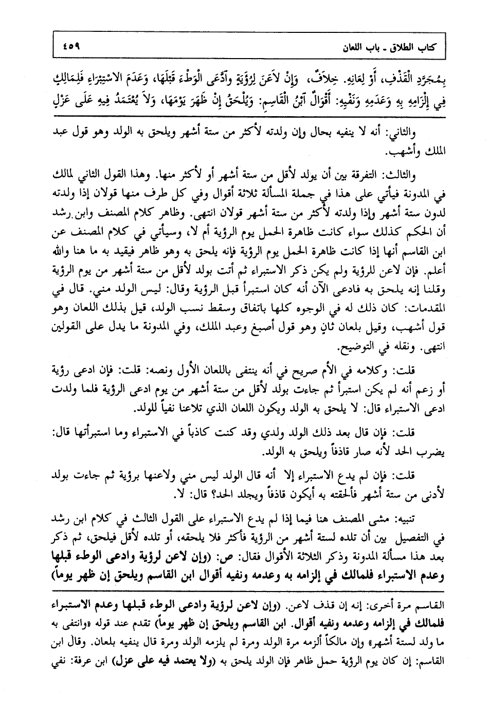 والثالث: التفرقة بين أن يولد لأقل من ستة أشهر أو لأكثر منها وهذا القول الثاني لمالك في المدونة: فيأتي على هذا في جملة المسألة ثلاثة أقوال وفي كل طرف منها قولان إذا ولدته لدون ستة أشهر وإذا ولدته لأكثر من ستة أشهر قولان انتهى. وظاهر كلام المصنف وابن رشد أن الحكم كذلك سواء كانت ظاهرة الحمل يوم الرؤية أم لا وسيأتي في كلام المصنف عن ابن القاسم أنها إذا كانت ظاهرة الحمل يوم الرؤية فإنه يلحق به وهو ظاهر فيقيد به ما هنا والله أعلم.فإن لاعن للرؤية ولم يكن ذكر الاستبراء ثم أتت بولد لأقل من ستة أشهر من يوم الرؤية وقلنا إنه يلحق به فادعى الآن أنه كان استبرأ قبل الرؤية وقال ليس الولد مني قال في المقدمات كان ذلك له في الوجوه كلها باتفاق وسقط نسب الولد قيل بذلك اللعان وهو قول أشهب وقيل بلعان ثان وهو قول أصبغ وعبد الملك وفي المدونة: ما يدل على القولين انتهى. ونقله في التوضيح.