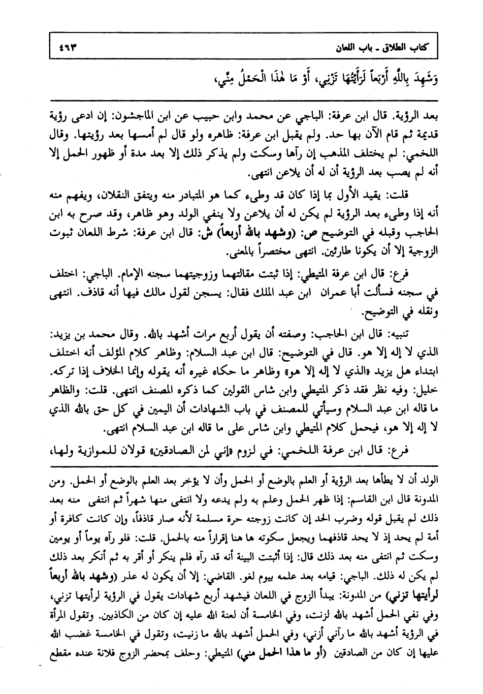 قلت: يقيد الأول بما إذا كان قد وطئ كما هو المتبادر منه ويتفق النقلان ويفهم منه أنه إذا وطئ بعد الرؤية لم يكن له أن يلاعن ولا ينفي الولد وهو ظاهر وقد صرح به ابن الحاجب وقبله في التوضيح ص: "وشهد بالله أربعا" ش: قال ابن عرفة: شرط اللعان ثبوت الزوجية إلا أن يكونا طارئين انتهى مختصرا بالمعنى.