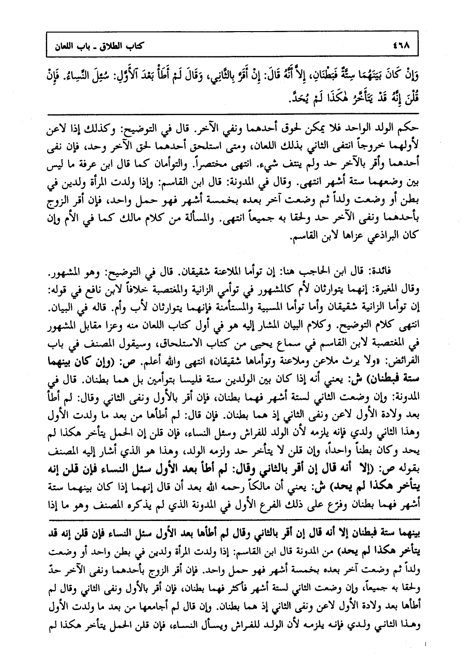 فائدة: قال ابن الحاجب هنا: إن توأما الملاعنة شقيقان قال في التوضيح: وهو المشهور وقال المغيرة: إنهما يتوارثان لأم كالمشهور في توأمي الزانية والمغتصبة خلافا لابن نافع في قوله إن توأما الزانية شقيقان وأما توأما المسبية والمستأمنة فإنهما يتوارثان لأب وأم قاله في البيان انتهى. كلام التوضيح وكلام البيان المشار إليه هو في أول كتاب اللعان منه وعزا مقابل المشهور في المغتصبة لابن القاسم في سماع يحيى من كتاب الاستلحاق وسيقول المصنف في باب الفرائض: "ولا يرث ملاعن وملاعنة وتوأماها شقيقان" انتهى. والله أعلم.ص: "وإن كان بينهما ستة فبطنان" ش: يعني أنه إذا كان بين الولدين ستة فليسا بتوأمين بل هما بطنان قال في المدونة: وإن وضعت الثاني لستة أشهر فهما بطنان فإن أقر بالأول ونفى الثاني وقال لم أطأ بعد ولادة الأول لاعن ونفى الثاني إذ هما بطنان فإن قال لم أطأها من بعد ما ولدت الأول وهذا الثاني ولدي فإنه يلزمه لأن الولد للفراش وسئل النساء فإن قلن إن الحمل يتأخر هكذا لم يحد وكان بطنا واحدا وإن قلن لا يتأخر حد ولزمه الولد وهذا هو الذي أشار إليه المصنف بقوله ص: "إلا أنه قال إن أقر بالثاني وقال لم أطأ بعد الأول سئل النساء فإن قلن إنه يتأخر هكذا لم يحد" ش: يعني أن مالكا رحمه الله بعد أن قال إنهما إذا كان بينهما ستة أشهر فهما بطنان وفرّع على ذلك الفرع الأول في المدونة الذي لم يذكره المصنف وهو ما إذا