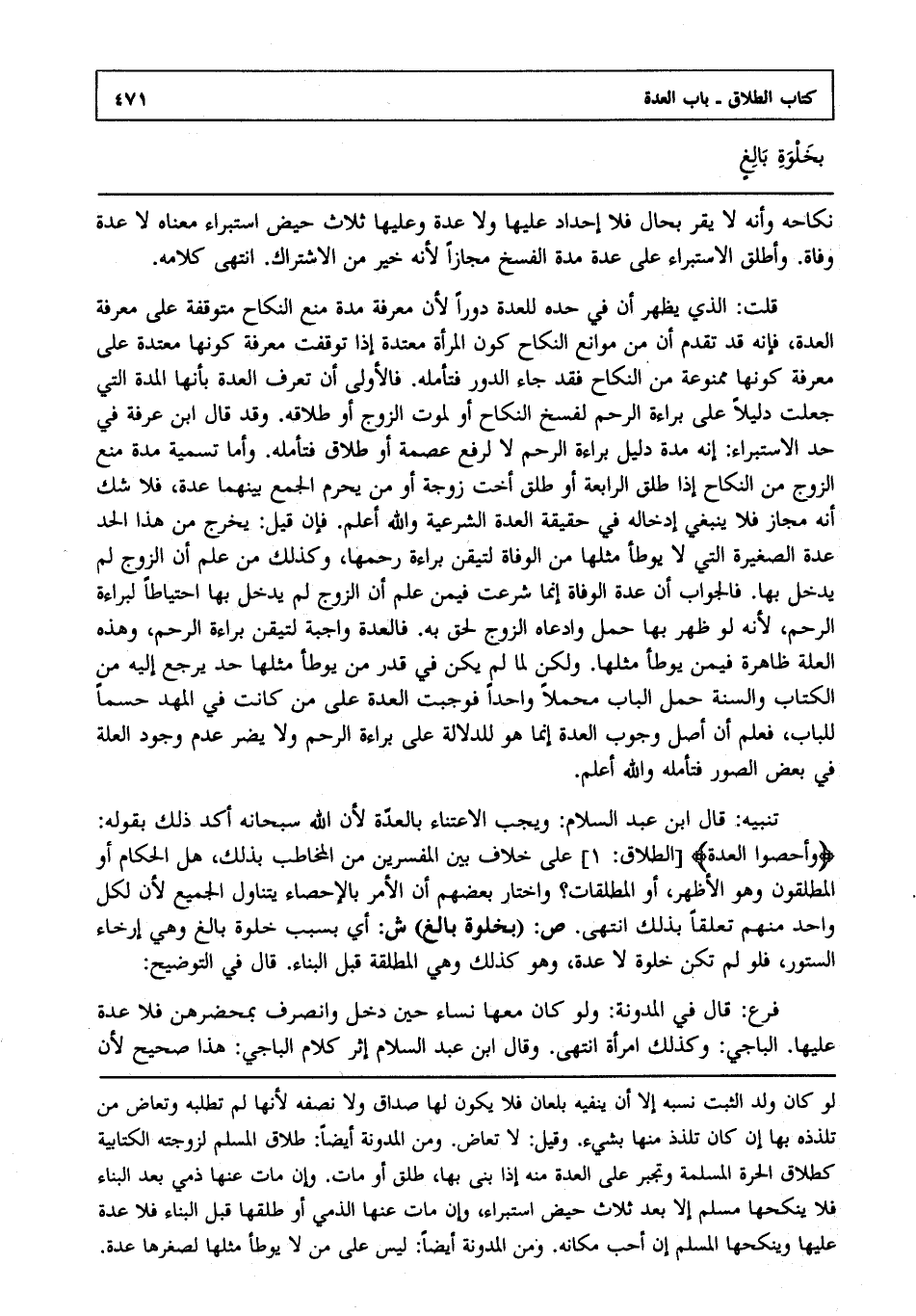 نكاحه وأنه لا يقر بحال فلا إحداد عليها ولا عدة وعليها ثلاث حيض استبراء معناه لا عدة وفاة وأطلق الاستبراء على عدة مدة الفسخ مجازا لأنه خير من الاشتراك انتهى كلامه. قلت: الذي يظهر أن في حده للعدة دورا لأن معرفة مدة منع النكاح متوقفة على معرفة العدة فإنه قد تقدم أن من موانع النكاح كون المرأة معتدة إذا توقفت معرفة كونها معتدة على معرفة كونها ممنوعة من النكاح فقد جاء الدور فتأمله فالأولى أن تعرف العدة بأنها المدة التي جعلت دليلا على براءة الرحم لفسخ النكاح أو لموت الزوج أو طلاقه وقد قال ابن عرفة: في حد الاستبراء إنه مدة دليل براءة الرحم لا لرفع عصمة أو طلاق فتأملهوأما تسمية مدة منع الزوج من النكاح إذا طلق الرابعة أو طلق أخت زوجة أو من يحرم الجمع بينهما عدة فلا شك أنه مجاز فلا ينبغي إدخاله في حقيقة العدة الشرعية والله أعلم.فإن قيل يخرج من هذا الحد عدة الصغيرة التي لا يوطأ مثلها من الوفاة لتيقن براءة رحمها وكذلك من علم أن الزوج لم يدخل بها فالجواب أن عدة الوفاة إنما شرعت فيمن علم أن الزوج لم يدخل بها احتياطا لبراءة الرحم لأنه لو ظهر بها حمل وادعاه الزوج لحق به فالعدة واجبة لتيقن براءة الرحم وهذه العلة ظاهرة فيمن يوطأ مثلها ولكن لما لم يكن في قدر من يوطأ مثلها حد يرجع إليه من الكتاب والسنة حمل الباب محملا واحدا فوجبت العدة على من كانت في المهد حسما للباب فعلم أن أصل وجوب العدة إنما هو للدلالة على براءة الرحم ولا يضر عدم وجود العلة في بعض الصور فتأمله والله أعلم.