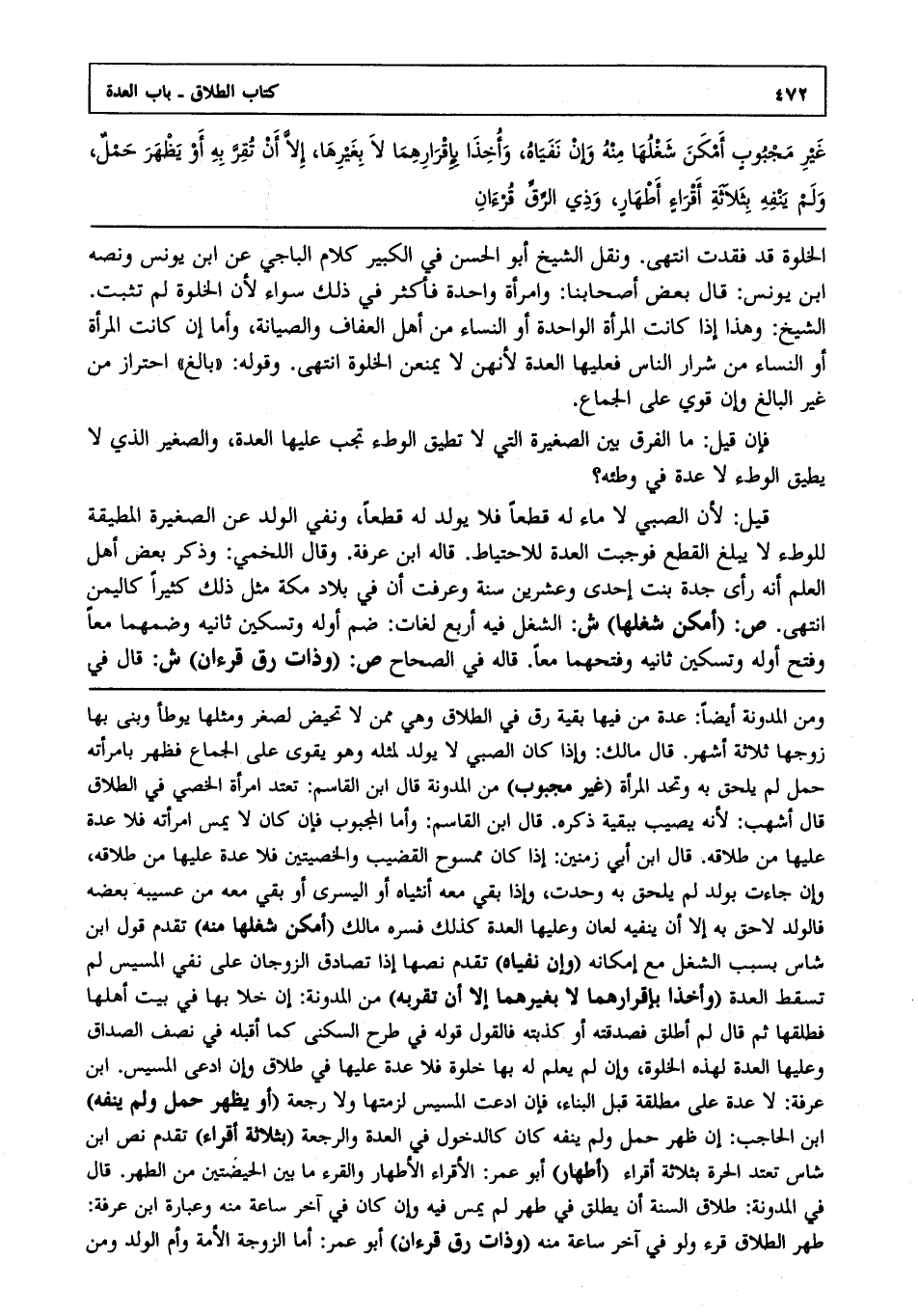قيل: لأن الصبي لا ماء له قطعا فلا يولد له قطعا ونفي الولد عن الصغيرة المطيقة للوطء لا يبلغ القطع فوجبت العدة للاحتياط قاله ابن عرفة وقال اللخمي: وذكر بعض أهل العلم أنه رأى جدة بنت إحدى وعشرين سنة وعرفت أن في بلاد مكة مثل ذلك كثيرا كاليمن انتهى. ص: "أمكن شغلها" ش: الشغل فيه أربع لغات ضم أوله وتسكين ثانيه وضمهما معا وفتح أوله وتسكين ثانيه وفتحهما معا قاله في الصحاح ص: "وذات رق قرءان" ش: قال في