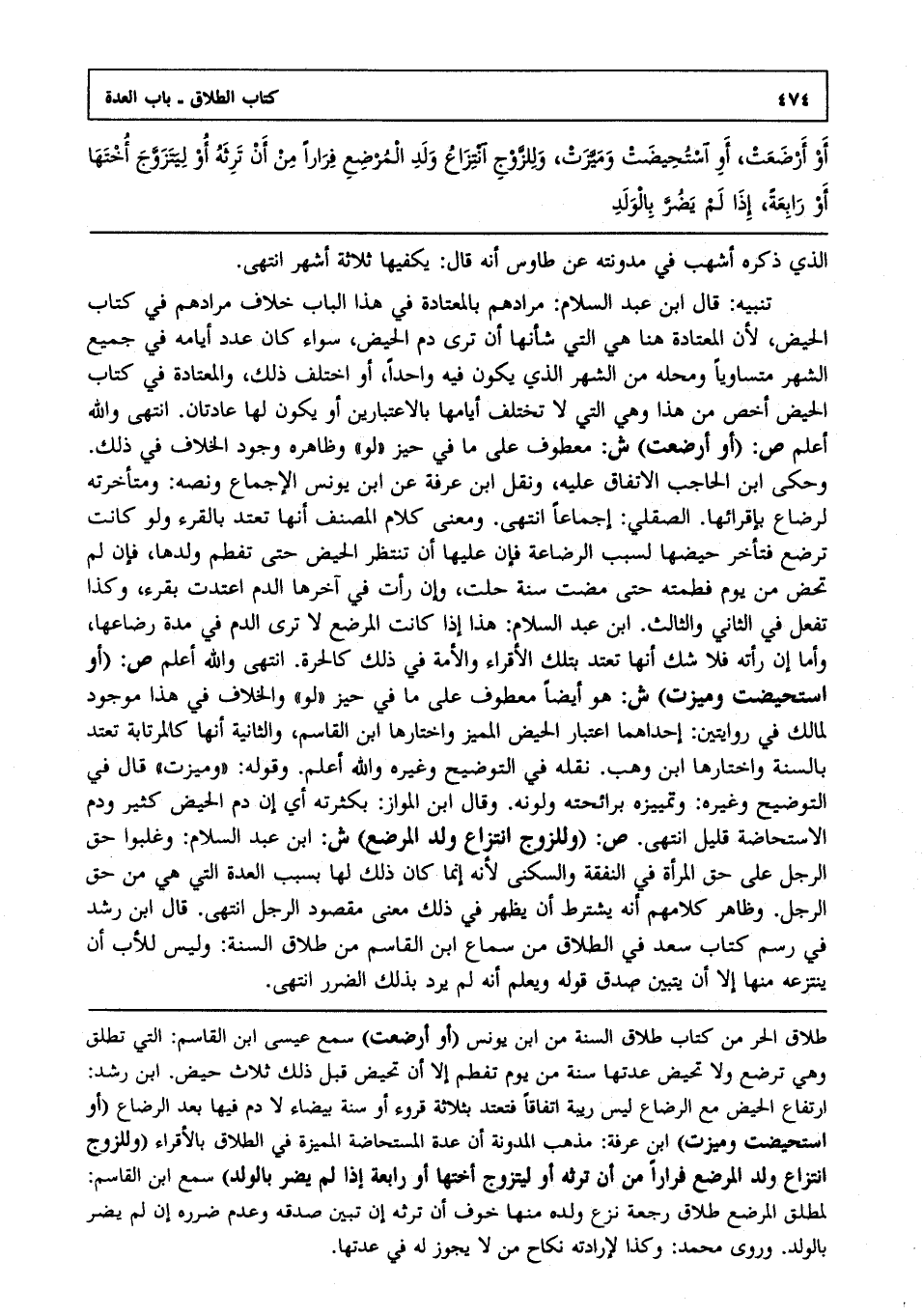 تنبيه: قال ابن عبد السلام: مرادهم بالمعتادة في هذا الباب خلاف مرادهم في كتاب الحيض لأن المعتادة هنا هي التي شأنها أن ترى دم الحيض سواء كان عدد أيامه في جميع الشهر متساويا ومحله من الشهر الذي يكون فيه واحدا أو اختلف ذلك والمعتادة في كتاب الحيض أخص من هذا وهي التي لا تختلف أيامها بالاعتبارين أو يكون لها عادتان انتهى. والله أعلم.ص: "أو أرضعت" ش: معطوف على ما في حيز "لو" وظاهره وجود الخلاف في ذلك وحكى ابن الحاجب الاتفاق عليه ونقل ابن عرفة عن ابن يونس الإجماع ونصه ومتأخرته لرضاع بإقرائها الصقلي إجماعا انتهى. ومعنى كلام المصنف أنها تعتد بالقرء ولو كانت ترضع فتأخر حيضها لسبب الرضاعة فإن عليها أن تنتظر الحيض حتى تفطم ولدها فإن لم تحض من يوم فطمته حتى مضت سنة حلت وإن رأت في آخرها الدم اعتدت بقرء وكذا تفعل في الثاني والثالث ابن عبد السلام هذا إذا كانت المرضع لا ترى الدم في مدة رضاعها وأما إن رأته فلا شك أنها تعتد بتلك الأقراء والأمة في ذلك كالحرةانتهى والله أعلم.ص: "أو استحيضت وميزت" ش: هو أيضا معطوف على ما في حيز "لو" والخلاف في هذا موجود لمالك في روايتين إحداهما اعتبار الحيض المميز واختارها ابن القاسم والثانية أنها كالمرتابة تعتد بالسنة واختارها ابن وهب نقله في التوضيح وغيره والله أعلم.وقوله "وميزت" قال في التوضيح: وغيره وتمييزه برائحته ولونه وقال ابن المواز بكثرته أي إن دم الحيض كثير ودم الاستحاضة قليل انتهى. ص: "وللزوج انتزاع ولد المرضع" ش: ابن عبد السلام وغلبوا حق الرجل على حق المرأة في النفقة والسكنى لأنه إنما كان ذلك لها بسبب العدة التي هي من حق الرجل وظاهر كلامهم أنه يشترط أن يظهر في ذلك معنى مقصود الرجل انتهى. قال ابن رشد: في رسم كتاب سعد في الطلاق من سماع ابن القاسم من طلاق السنة وليس للأب أن ينتزعه منها إلا أن يتبين صدق قوله ويعلم أنه لم يرد بذلك الضرر انتهى.