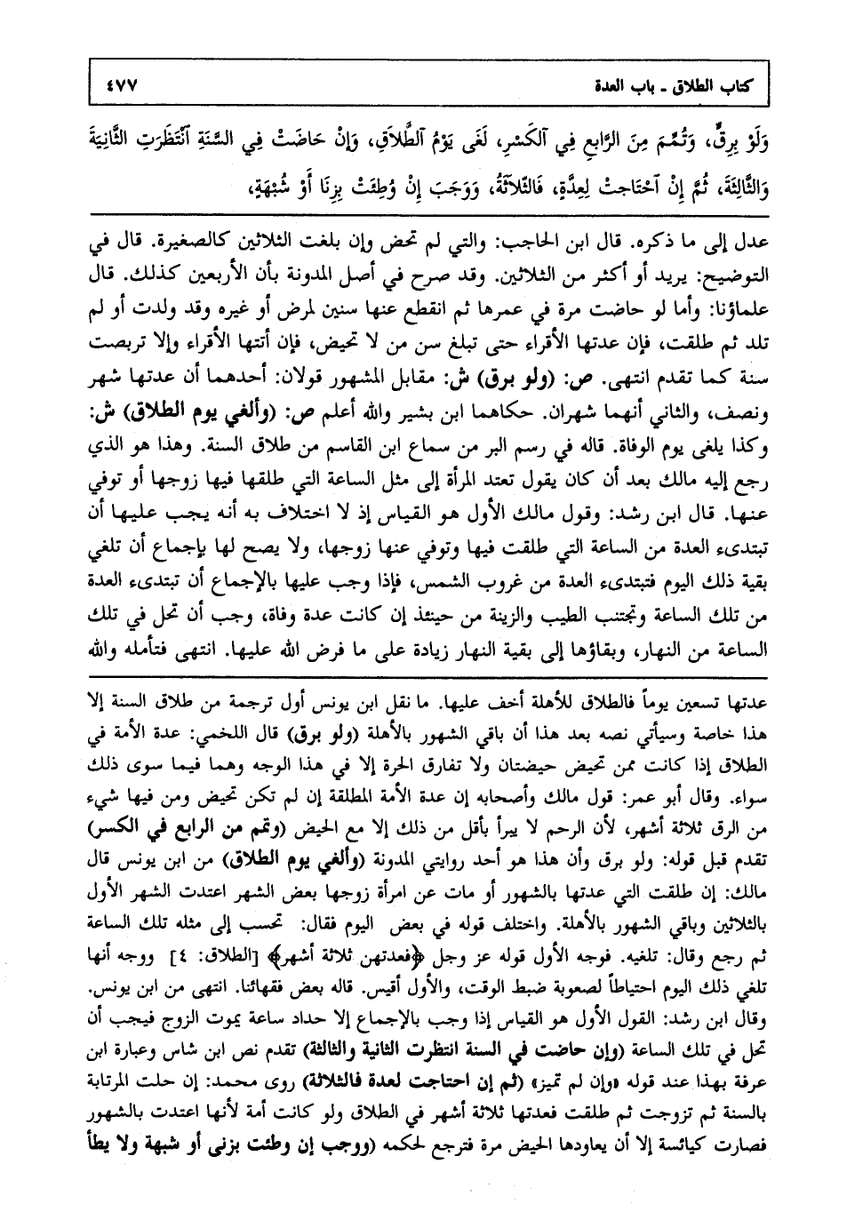 عدل إلى ما ذكره قال ابن الحاجب: والتي لم تحض وإن بلغت الثلاثين كالصغيرة قال في التوضيح: يريد أو أكثر من الثلاثين وقد صرح في أصل المدونة: بأن الأربعين كذلك قال علماؤنا وأما لو حاضت مرة في عمرها ثم انقطع عنها سنين لمرض أو غيره وقد ولدت أو لم تلد ثم طلقت فإن عدتها الأقراء حتى تبلغ سن من لا تحيض فإن أتتها الأقراء وإلا تربصت سنة كما تقدم انتهى. ص: "ولو برق" ش: مقابل المشهور قولان أحدهما أن عدتها شهر ونصف والثاني أنهما شهران حكاهما ابن بشير والله أعلم.ص: "وألغي يوم الطلاق" ش: وكذا يلغى يوم الوفاة قاله في رسم البر من سماع ابن القاسم من طلاق السنة وهذا هو الذي رجع إليه مالك بعد أن كان يقول تعتد المرأة إلى مثل الساعة التي طلقها فيها زوجها أو توفي عنها قال ابن رشد: وقول مالك الأول: هو القياس إذ لا اختلاف به أنه يجب عليها أن تبتدئ العدة من الساعة التي طلقت فيها وتوفي عنها زوجها ولا يصح لها بإجماع أن تلغي بقية ذلك اليوم فتبتدئ العدة من غروب الشمس فإذا وجب عليها بالإجماع أن تبتدئ العدة من تلك الساعة وتجتنب الطيب والزينة من حينئذ إن كانت عدة وفاة وجب أن تحل في تلك الساعة من النهار وبقاؤها إلى بقية النهار زيادة على ما فرض الله عليها انتهى. فتأمله والله
