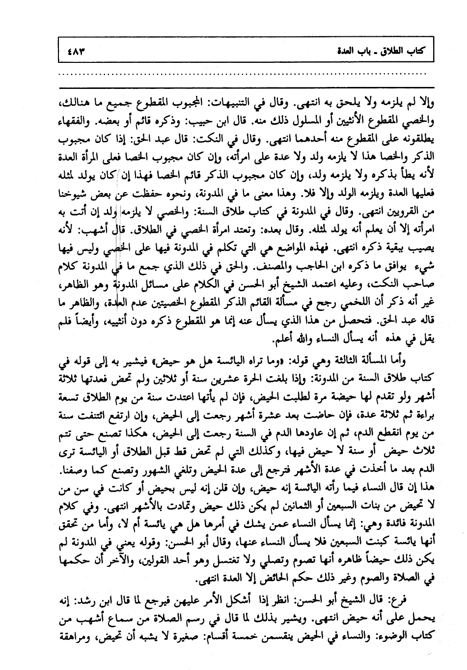 وأما المسألة الثالثة وهي قوله: "وما تراه اليائسة هل هو حيض" فيشير به إلى قوله في كتاب طلاق السنة من المدونة: وإذا بلغت الحرة عشرين سنة أو ثلاثين ولم تحض فعدتها ثلاثة أشهر ولو تقدم لها حيضة مرة لطلبت الحيض فإن لم يأتها اعتدت سنة من يوم الطلاق تسعة براءة ثم ثلاثة عدة فإن حاضت بعد عشرة أشهر رجعت إلى الحيض وإن ارتفع ائتنفت سنة من يوم انقطع الدم ثم إن عاودها الدم في السنة رجعت إلى الحيض هكذا تصنع حتى تتم ثلاث حيض أو سنة لا حيض فيها وكذلك التي لم تحض قط قبل الطلاق أو اليائسة ترى الدم بعد ما أخذت في عدة الأشهر فترجع إلى عدة الحيض وتلغي الشهور وتصنع كما وصفنا هذا إن قال النساء فيما رأته اليائسة إنه حيض وإن قلن إنه ليس بحيض أو كانت في سن من لا تحيض من بنات السبعين أو الثمانين لم يكن ذلك حيض وتمادت بالأشهر انتهى. وفي كلام المدونة: فائدة وهي إنما يسأل النساء عمن يشك في أمرها هل هي يائسة أم لا وأما من تحقق أنها يائسة كبنت السبعين فلا يسأل النساء عنها وقال أبو الحسن وقوله يعني في المدونة: لم يكن ذلك حيضا ظاهره أنها تصوم وتصلي ولا تغتسل وهو أحد القولين والآخر أن حكمها في الصلاة والصوم وغير ذلك حكم الحائض إلا العدة انتهى.