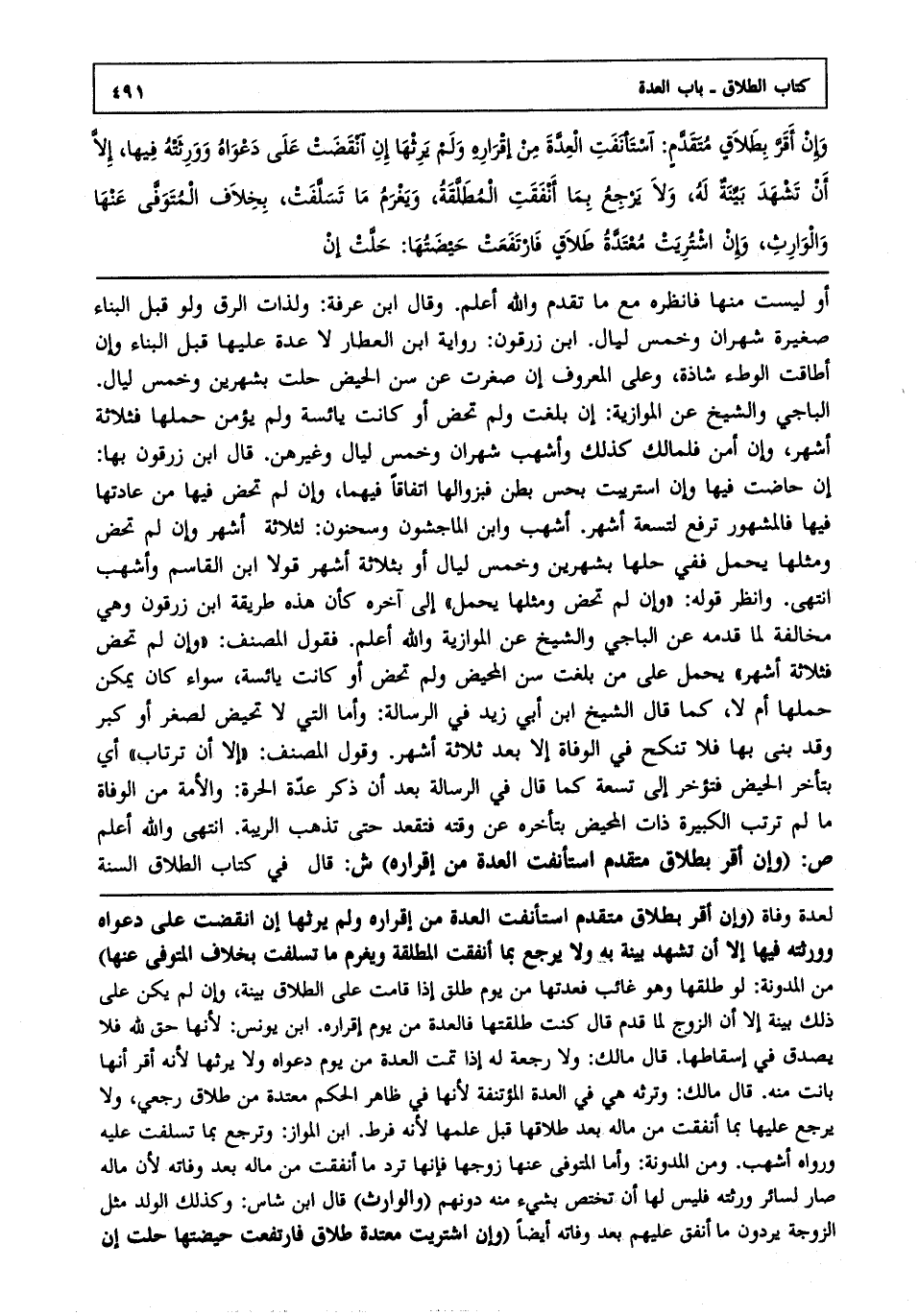 أو ليست منها فانظره مع ما تقدم والله أعلم.وقال ابن عرفة ولذات الرق ولو قبل البناء صغيرة شهران وخمس ليال ابن زرقون: رواية ابن العطار لا عدة عليها قبل البناء وإن أطاقت الوطء شاذة وعلى المعروف إن صغرت عن سن الحيض حلت بشهرين وخمس ليال الباجي والشيخ عن الموازية: إن بلغت ولم تحض أو كانت يائسة ولم يؤمن حملها فثلاثة أشهر وإن أمن فلمالك كذلك وأشهب شهران وخمس ليال وغيرهن قال ابن زرقون بها: إن حاضت فيها وإن استريبت بحس بطن فبزوالها اتفاقا فيهما وإن لم تحض فيها من عادتها فيها فالمشهور ترفع لتسعة أشهر أشهب وابن الماجشون وسحنون: لثلاثة أشهر وإن لم تحض ومثلها يحمل ففي حلها بشهرين وخمس ليال أو بثلاثة أشهر قولا ابن القاسم وأشهب انتهى. وانظر قوله: "وإن لم تحض ومثلها يحمل" إلى آخره كأن هذه طريقة ابن زرقون وهي مخالفة لما قدمه عن الباجي والشيخ عن الموازية والله أعلم.فقول المصنف: "وإن لم تحض فثلاثة أشهر" يحمل على من بلغت سن المحيض ولم تحض أو كانت يائسة سواء كان يمكن حملها أم لا كما قال الشيخ ابن أبي زيد في الرسالة وأما التي لا تحيض لصغر أو كبر وقد بنى بها فلا تنكح في الوفاة إلا بعد ثلاثة أشهر وقول المصنف: "إلا أن ترتاب" أي بتأخر الحيض فتؤخر إلى تسعة كما قال في الرسالة بعد أن ذكر عدة الحرة والأمة من الوفاة ما لم ترتب الكبيرة ذات المحيض بتأخره عن وقته فتقعد حتى تذهب الريبة انتهى. والله أعلم.ص: "وإن أقر بطلاق متقدم استأنفت العدة من إقراره" ش: قال في كتاب الطلاق السنة