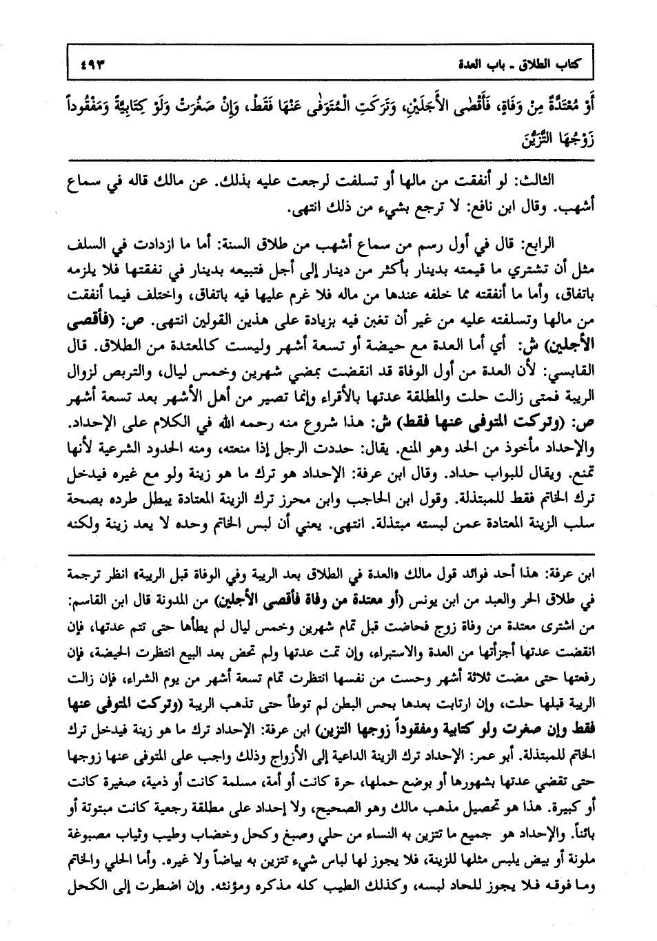 الرابع: قال في أول رسم من سماع أشهب من طلاق السنة أما ما ازدادت في السلف مثل أن تشتري ما قيمته بدينار بأكثر من دينار إلى أجل فتبيعه بدينار في نفقتها فلا يلزمه باتفاق وأما ما أنفقته مما خلفه عندها من ماله فلا غرم عليها فيه باتفاق واختلف فيما أنفقت من مالها وتسلفته عليه من غير أن تغبن فيه بزيادة على هذين القولين انتهى. ص: "فأقصى الأجلين" ش: أي أما العدة مع حيضة أو تسعة أشهر وليست كالمعتدة من الطلاق قال القابسي: لأن العدة من أول الوفاة قد انقضت بمضي شهرين وخمس ليال والتربص لزوال الريبة فمتى زالت حلت والمطلقة عدتها بالأقراء وإنما تصير من أهل الأشهر بعد تسعة أشهر ص: "وتركت المتوفى عنها فقط" ش: هذا شروع منه رحمه الله في الكلام على الإحداد والإحداد مأخوذ من الحد وهو المنع يقال: حددت الرجل إذا منعته ومنه الحدود الشرعية لأنها تمنع ويقال للبواب حداد وقال ابن عرفة: الإحداد هو ترك ما هو زينة ولو مع غيره فيدخل ترك الخاتم فقط للمبتذلة وقول ابن الحاجب وابن محرز ترك الزينة المعتادة يبطل طرده بصحة سلب الزينة المعتادة عمن لبسته مبتذلة انتهى. يعني أن لبس الخاتم وحده لا يعد زينة ولكنه