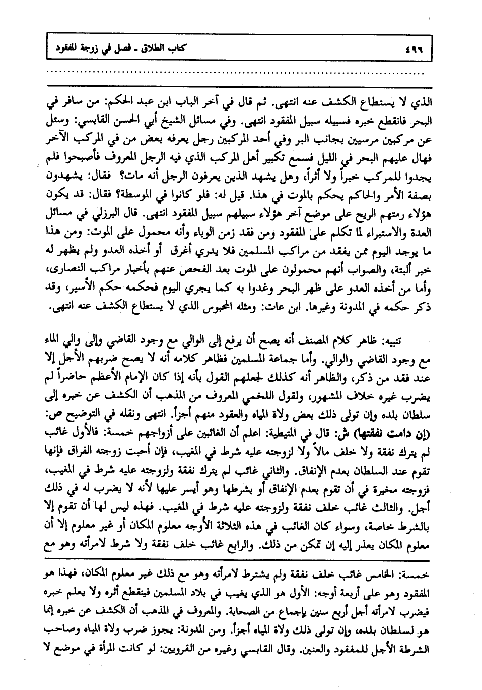 الذي لا يستطاع الكشف عنه انتهى. ثم قال في آخر الباب ابن عبد الحكم: من سافر في البحر فانقطع خبره فسبيله سبيل المفقود انتهى. وفي مسائل الشيخ أبي الحسن القابسي: وسئل عن مركبين مرسيين بجانب البر وفي أحد المركبين رجل يعرفه بعض من في المركب الآخر فهال عليهم البحر في الليل فسمع تكبير أهل المركب الذي فيه الرجل المعروف فأصبحوا فلم يجدوا للمركب خبرا ولا أثرا وهل يشهد الذين يعرفون الرجل أنه مات فقال: يشهدون بصفة الأمر والحاكم يحكم بالموت في هذا قيل له فلو كانوا في الموسطة فقال قد يكون هؤلاء رمتهم الريح على موضع آخر هؤلاء سبيلهم سبيل المفقود انتهى. قال البرزلي في مسائل العدة والاستبراء لما تكلم على المفقود ومن فقد زمن الوباء وأنه محمول على الموت ومن هذا ما يوجد اليوم ممن يفقد من مراكب المسلمين فلا يدري أغرق أو أخذه العدو ولم يظهر له خبر ألبتة والصواب أنهم محمولون على الموت بعد الفحص عنهم بأخبار مراكب النصارى وأما من أخذه العدو على ظهر البحر وغدوا به كما يجري اليوم فحكمه حكم الأسير وقد ذكر حكمه في المدونة: وغيرها ابن عات ومثله المحبوس الذي لا يستطاع الكشف عنه انتهى.