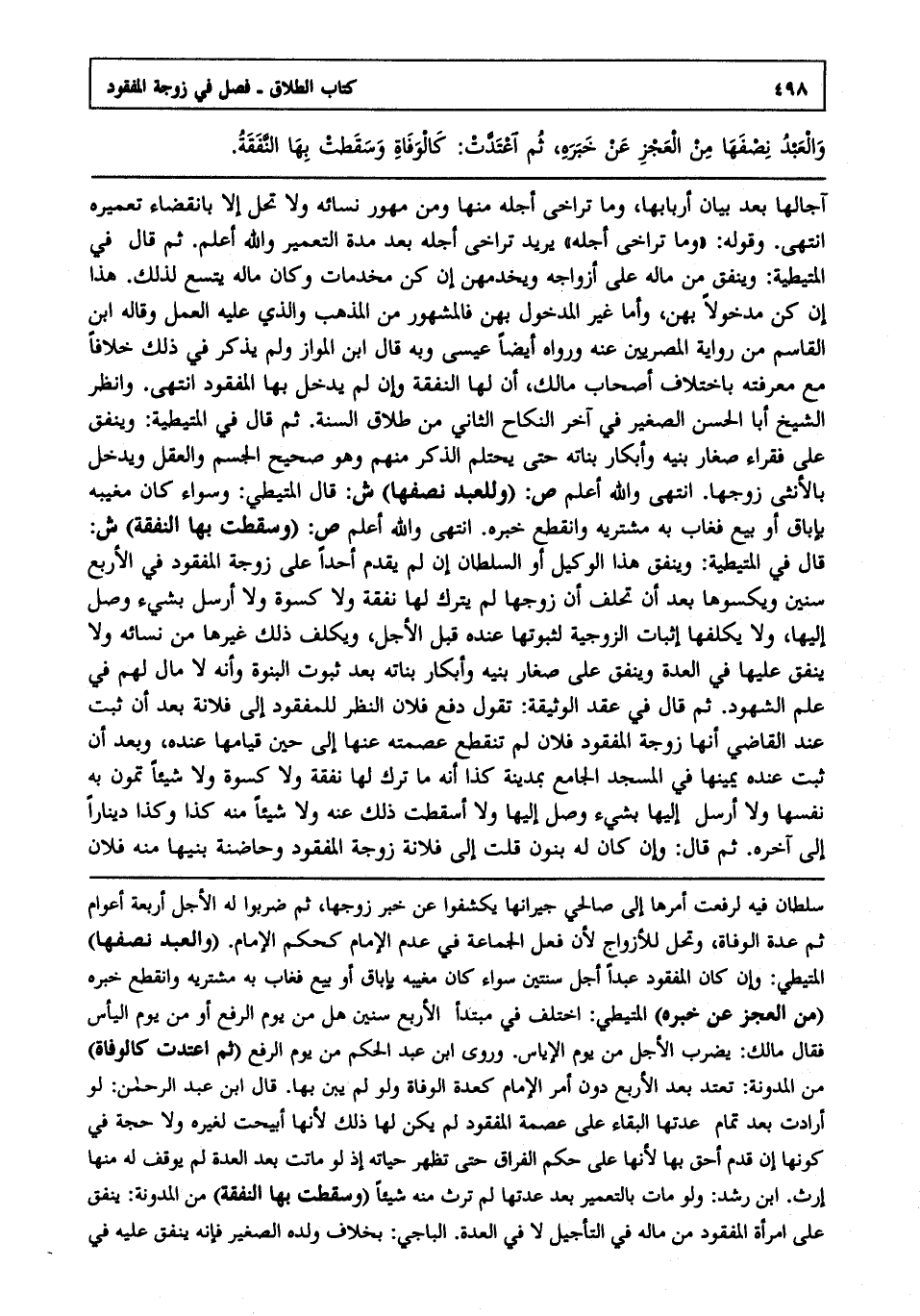 آجالها بعد بيان أربابها وما تراخى أجله منها ومن مهور نسائه ولا تحل إلا بانقضاء تعميره انتهى. وقوله وما تراخى أجله يريد تراخى أجله بعد مدة التعمير والله أعلمثم قال في المتيطية وينفق من ماله على أزواجه ويخدمهن إن كن مخدمات وكان ماله يتسع لذلك هذا إن كن مدخولا بهن وأما غير المدخول بهن فالمشهور من المذهب والذي عليه العمل وقاله ابن القاسم من رواية المصريين عنه ورواه أيضا عيسى وبه قال ابن المواز ولم يذكر في ذلك خلافا مع معرفته باختلاف أصحاب مالك أن لها النفقة وإن لم يدخل بها المفقود انتهى. وانظر الشيخ أبا الحسن الصغير في آخر النكاح الثاني من طلاق السنة ثم قال في المتيطية وينفق على فقراء صغار بنيه وأبكار بناته حتى يحتلم الذكر منهم وهو صحيح الجسم والعقل ويدخل بالأنثى زوجها انتهى. والله أعلم.ص: "وللعبد نصفها" ش: قال المتيطي وسواء كان مغيبه بإباق أو بيع فغاب به مشتريه وانقطع خبره انتهى. والله أعلم.ص: "وسقطت بها النفقة" ش: قال في المتيطية وينفق هذا الوكيل أو السلطان إن لم يقدم أحدا على زوجة المفقود في الأربع سنين ويكسوها بعد أن تحلف أن زوجها لم يترك لها نفقة ولا كسوة ولا أرسل بشيء وصل إليها ولا يكلفها إثبات الزوجية لثبوتها عنده قبل الأجل ويكلف ذلك غيرها من نسائه ولا ينفق عليها في العدة وينفق على صغار بنيه وأبكار بناته بعد ثبوت البنوة وأنه لا مال لهم في علم الشهود ثم قال في عقد الوثيقة تقول دفع فلان النظر للمفقود إلى فلانة بعد أن ثبت عند القاضي أنها زوجة المفقود فلان لم تنقطع عصمته عنها إلى حين قيامها عنده وبعد أن ثبت عنده يمينها في المسجد الجامع بمدينة كذا أنه ما ترك لها نفقة ولا كسوة ولا شيئا تمون به نفسها ولا أرسل إليها بشيء وصل إليها ولا أسقطت ذلك عنه ولا شيئا منه كذا وكذا دينارا إلى آخره ثم قال وإن كان له بنون قلت: إلى فلانة زوجة المفقود وحاضنة بنيها منه فلان