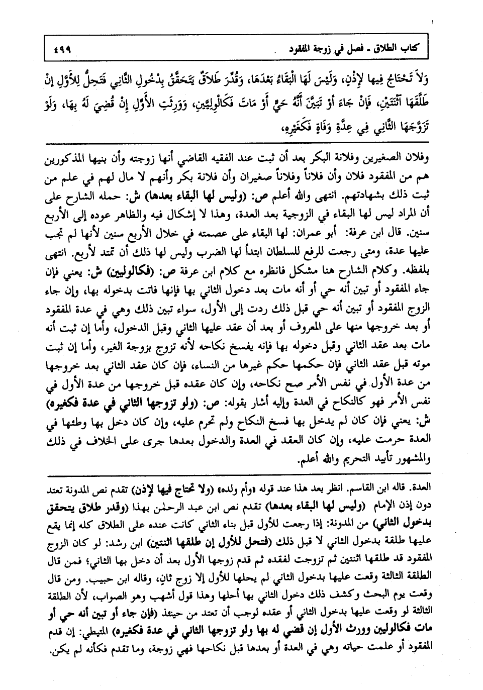 وفلان الصغيرين وفلانة البكر بعد أن ثبت عند الفقيه القاضي أنها زوجته وأن بنيها المذكورين هم من المفقود فلان وأن فلانا وفلانا صغيران وأن فلانة بكر وأنهم لا مال لهم في علم من ثبت ذلك بشهادتهم انتهى. والله أعلم.ص: "وليس لها البقاء بعدها" ش: حمله الشارح على أن المراد ليس لها البقاء في الزوجية بعد العدة وهذا لا إشكال فيه والظاهر عوده إلى الأربع سنين قال ابن عرفة: أبو عمران: لها البقاء على عصمته في خلال الأربع سنين لأنها لم تجب عليها عدة ومتى رجعت للرفع للسلطان ابتدأ لها الضرب وليس لها ذلك أن تمتد لأربع انتهى. بلفظهوكلام الشارح هنا مشكل فانظره مع كلام ابن عرفة ص: "فكالوليين" ش: يعني فإن جاء المفقود أو تبين أنه حي أو أنه مات بعد دخول الثاني بها فإنها فاتت بدخوله بها وإن جاء الزوج المفقود أو تبين أنه حي قبل ذلك ردت إلى الأول سواء تبين ذلك وهي في عدة المفقود أو بعد خروجها منها على المعروف أو بعد أن عقد عليها الثاني وقبل الدخول وأما إن ثبت أنه مات بعد عقد الثاني وقبل دخوله بها فإنه يفسخ نكاحه لأنه تزوج بزوجة الغير وأما إن ثبت موته قبل عقد الثاني فإن حكمها حكم غيرها من النساء فإن كان عقد الثاني بعد خروجها من عدة الأول في نفس الأمر صح نكاحه وإن كان عقده قبل خروجها من عدة الأول في نفس الأمر فهو كالنكاح في العدة وإليه أشار بقوله ص: "ولو تزوجها الثاني في عدة فكغيره" ش: يعني فإن كان لم يدخل بها فسخ النكاح ولم تحرم عليه وإن كان دخل بها وطئها في العدة حرمت عليه وإن كان العقد في العدة والدخول بعدها جرى على الخلاف في ذلك والمشهور تأبيد التحريم والله أعلم.