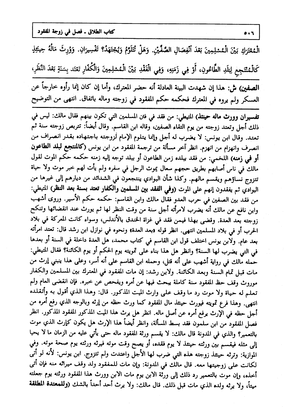 المعترك بين المسلمين بعد انفصال الصفين، وهل تتلوم ويجتهد؟ تفسيران. وورث ماله حينئذ كالمنتجع لبلد الطاعون، أو في زمنه، وفي الفقد بين المسلمين والكفار تعتد بسنة بعد النظر،