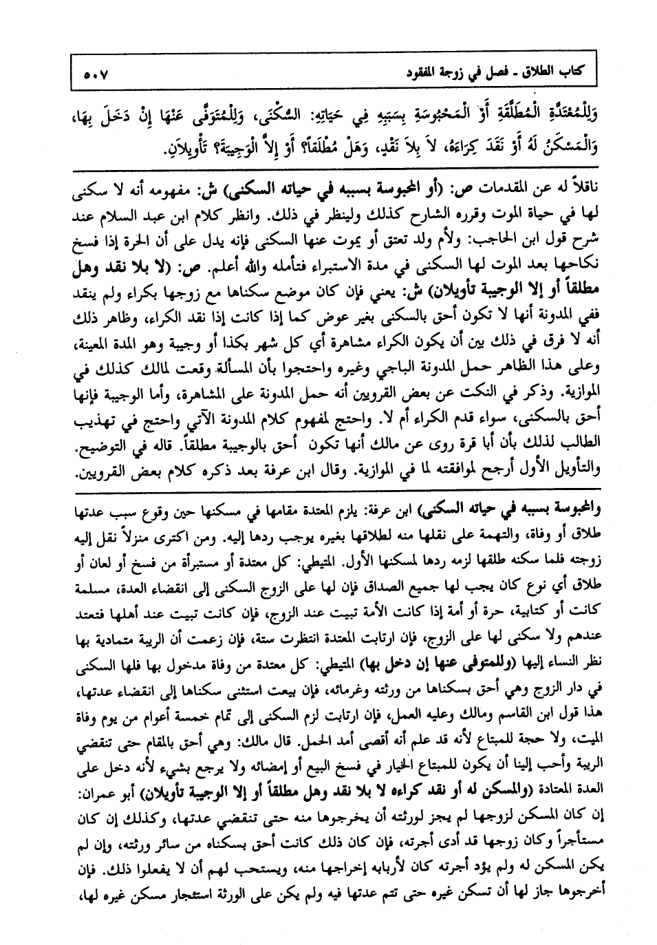 وللمعتدة المطلقة أو المحبوسة بسببه في حياته: السكنى، وللمتوفى عنها إن دخل بها، والمسكن له أو نقد كراءه، لا بلا نقد، وهل مطلقا؟ أو إلا الوجيبة؟ تأويلان.