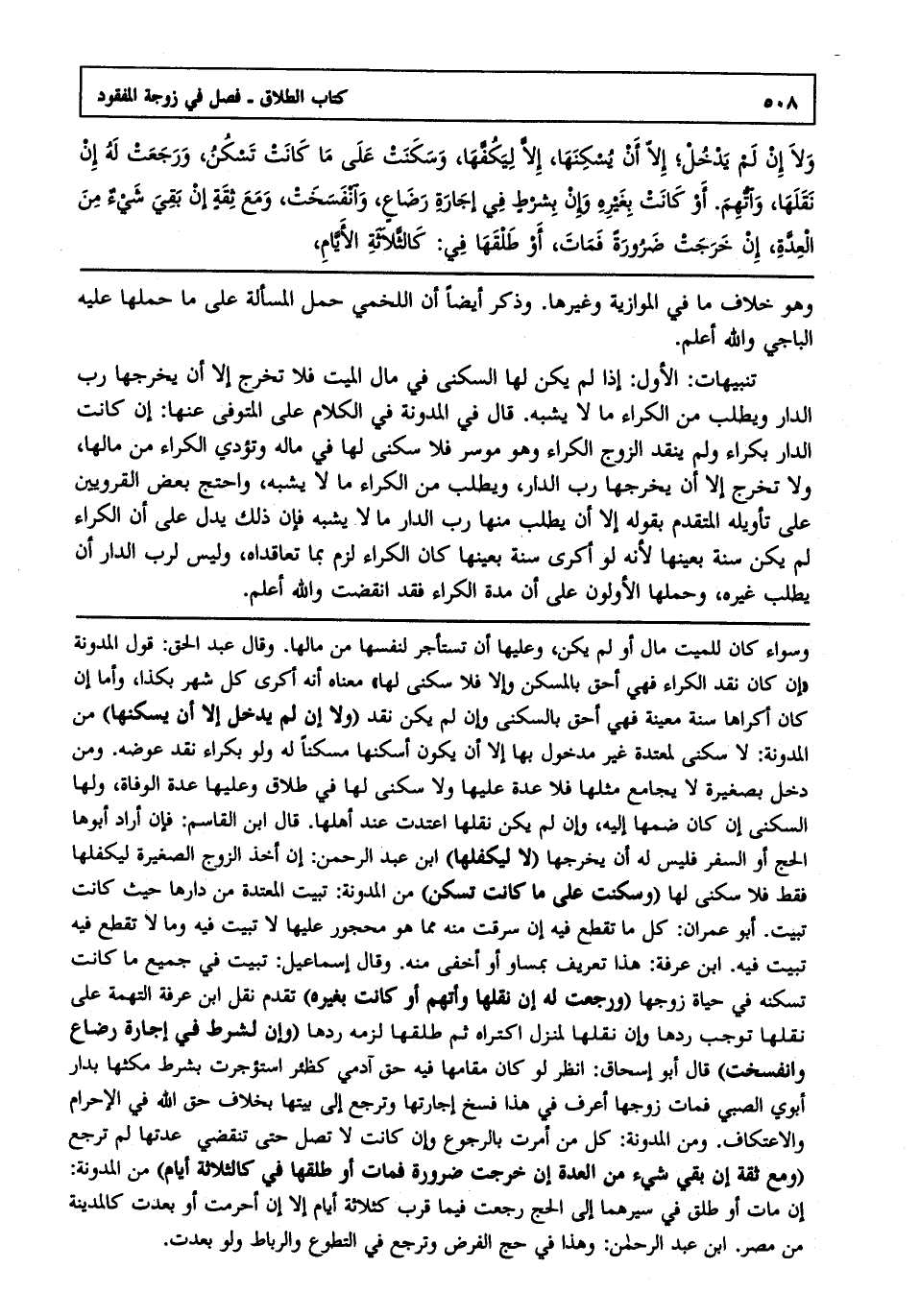 تنبيهات: الأول: إذا لم يكن لها السكنى في مال الميت فلا تخرج إلا أن يخرجها رب الدار ويطلب من الكراء ما لا يشبه قال في المدونة: في الكلام على المتوفى عنها: إن كانت الدار بكراء ولم ينقد وهو موسر فلا سكنى لها في ماله وتؤدي الكراء من مالها ولا تخرج إلا أن يخرجها رب الدار ويطلب من الكراء ما لا يشبه واحتج بعض القرويين على تأويله المتقدم بقوله إلا أن يطلب منها رب الدار ما لا يشبه فإن ذلك يدل على أن الكراء لم يكن سنة بعينها لأنه لو أكرى سنة بعينها كان الكراء لزم بما تعاقداه وليس لرب الدار أن يطلب غيره وحملها الأولون على أن مدة الكراء فقد انقضت والله أعلم.