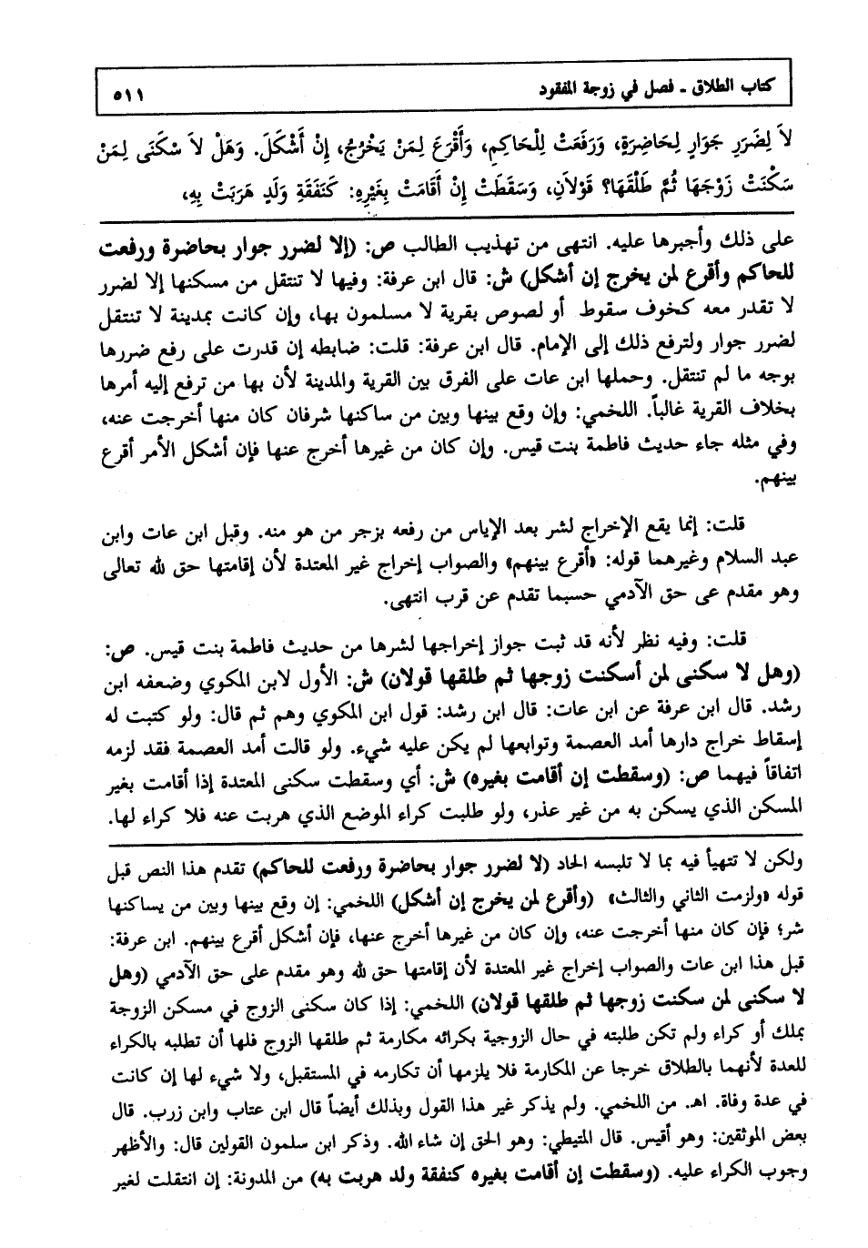 على ذلك وأجبرها عليه انتهى. من تهذيب الطالب ص: "إلا لضرر جوار بحاضرة ورفعت للحاكم وأقرع لمن يخرج إن أشكل" ش: قال ابن عرفة: وفيها لا تنتقل من مسكنها إلا لضرر لا تقدر معه كخوف سقوط أو لصوص بقرية لا مسلمون بها وإن كانت بمدينة لا تنتقل لضرر جوار ولترفع ذلك إلى الإمام قال ابن عرفة: قلت: ضابطه إن قدرت على رفع ضررها بوجه ما لم تنتقل وحملها ابن عات على الفرق بين القرية والمدينة لأن بها من ترفع إليه أمرها بخلاف القرية غالبا اللخمي: وإن وقع بينها وبين من ساكنها شرفان كان منها أخرجت عنه وفي مثله جاء حديث فاطمة بنت قيس وإن كان من غيرها أخرج عنها فإن أشكل الأمر أقرع بينهم.