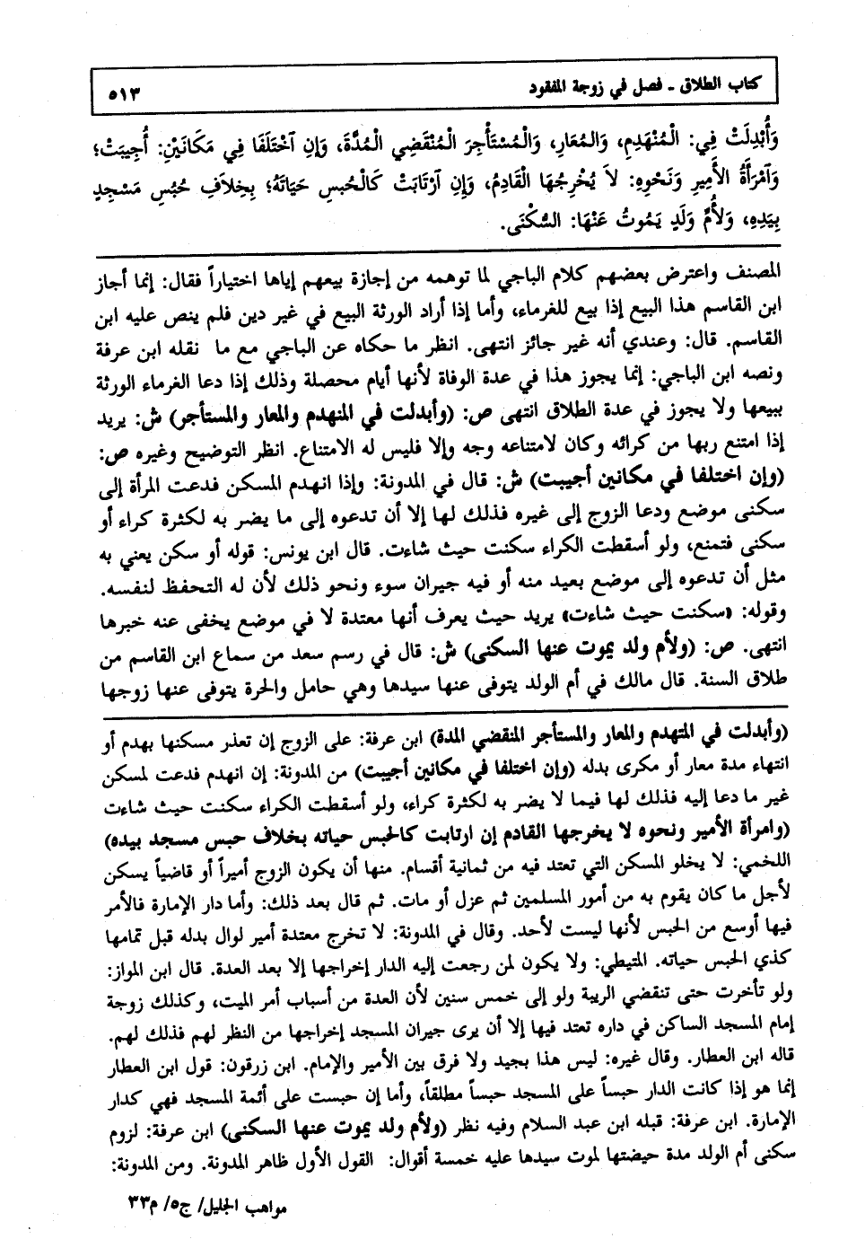 المصنف واعترض بعضهم كلام الباجي لما توهمه من إجازة بيعهم إياها اختيارا فقال إنما أجاز ابن القاسم هذا البيع إذا بيع للغرماء وأما إذا أراد الورثة البيع في غير دين فلم ينص عليه ابن القاسم قال وعندي أنه غير جائز انتهى. انظر ما حكاه عن الباجي مع ما نقله ابن عرفة ونصه ابن الباجي إنما يجوز هذا في عدة الوفاة لأنها أيام محصلة وذلك إذا دعا الغرماء الورثة ببيعها ولا يجوز في عدة الطلاق انتهى. ص: "وأبدلت في المنهدم والمعار والمستأجر" ش: يريد إذا امتنع ربها من كرائه وكان لامتناعه وجه وإلا فليس له الامتناعانظر التوضيح وغيره ص: "وإن اختلفا في مكانين أجيبت" ش: قال في المدونة: وإذا انهدم المسكن فدعت المرأة إلى سكنى موضع ودعا الزوج إلى غيره فذلك لها إلا أن تدعوه إلى ما يضر به لكثرة كراء أو سكنى فتمنع ولو أسقطت الكراء سكنت حيث شاءت قال ابن يونس قوله أو سكن يعني به مثل أن تدعوه إلى موضع بعيد منه أو فيه جيران سوء ونحو ذلك لأن له التحفظ لنفسه وقوله: "سكنت حيث شاءت" يريد حيث يعرف أنها معتدة لا في موضع يخفى عنه خبرها انتهى. ص: "ولأم ولد يموت عنها السكنى" ش: قال في رسم سعد من سماع ابن القاسم من طلاق السنة قال مالك في أم الولد يتوفى عنها سيدها وهي حامل والحرة يتوفى عنها زوجها